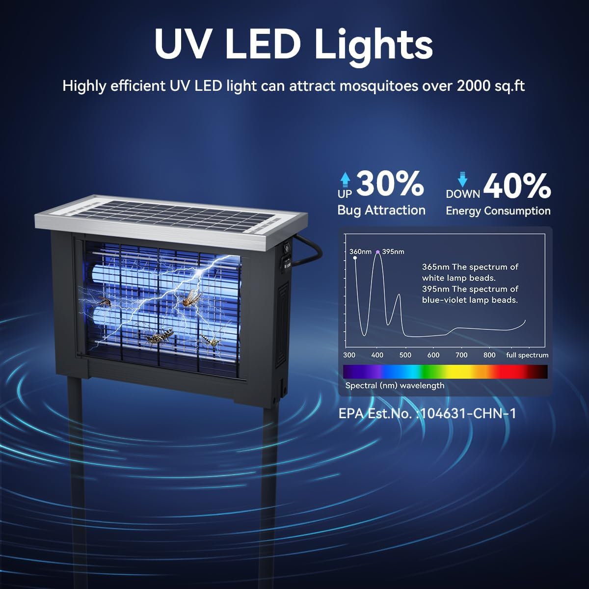 - COMPLIANCE INFORMATION: The camping solar bug light is equipped with a protective grid to avoid accidental contact by children and pets, making it a reliable mosquito-killing solution for family use. EPA Establishment No. 104631-CHN-1 confirms compliance with regulatory standards for pest control devices. For correct operation and precautions, please consult the included instruction manual before use solar mosquito lamp.