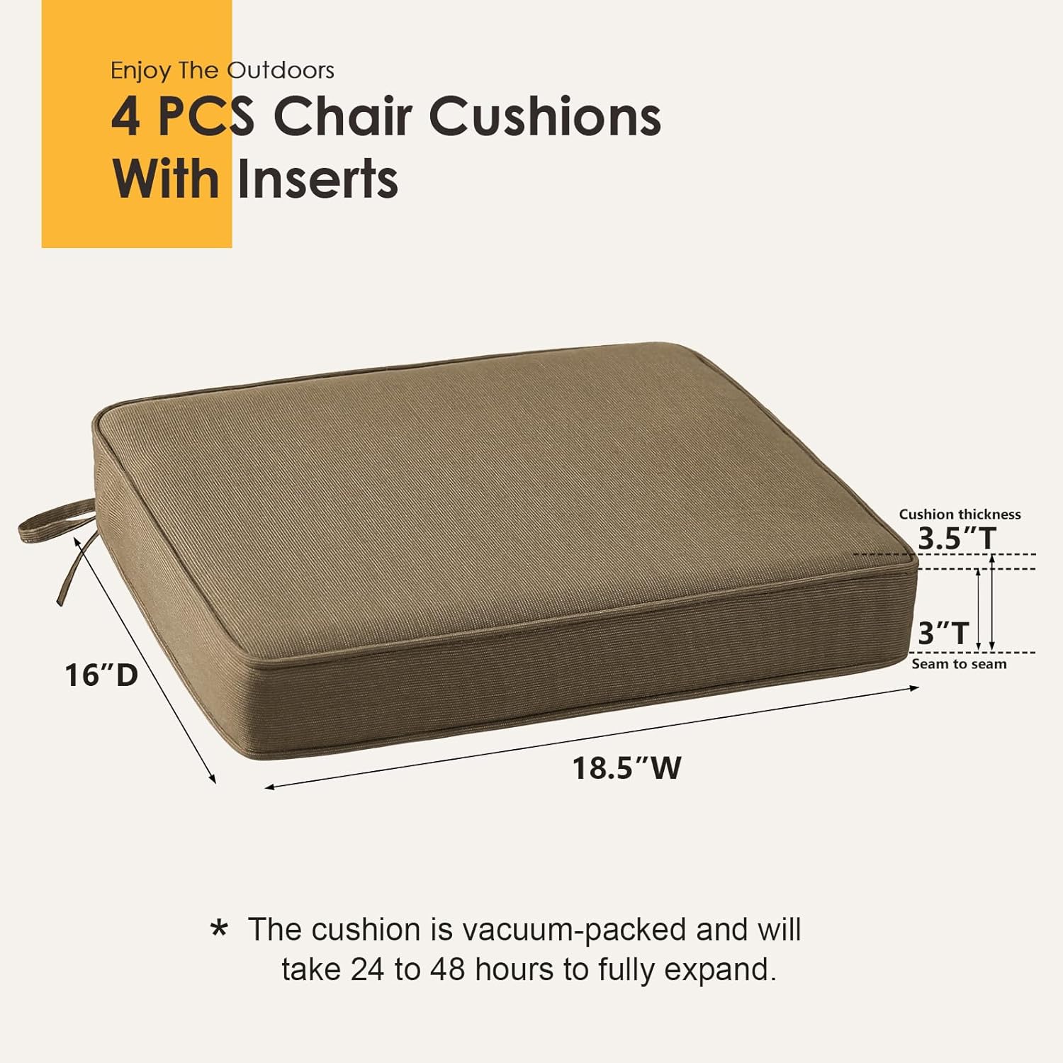 - Please measure the seat dimensions of your furniture before ordering. Sunbrella outdoor chair cushions measure 18.5" x 16" x 3", suitable for most patio chairs.