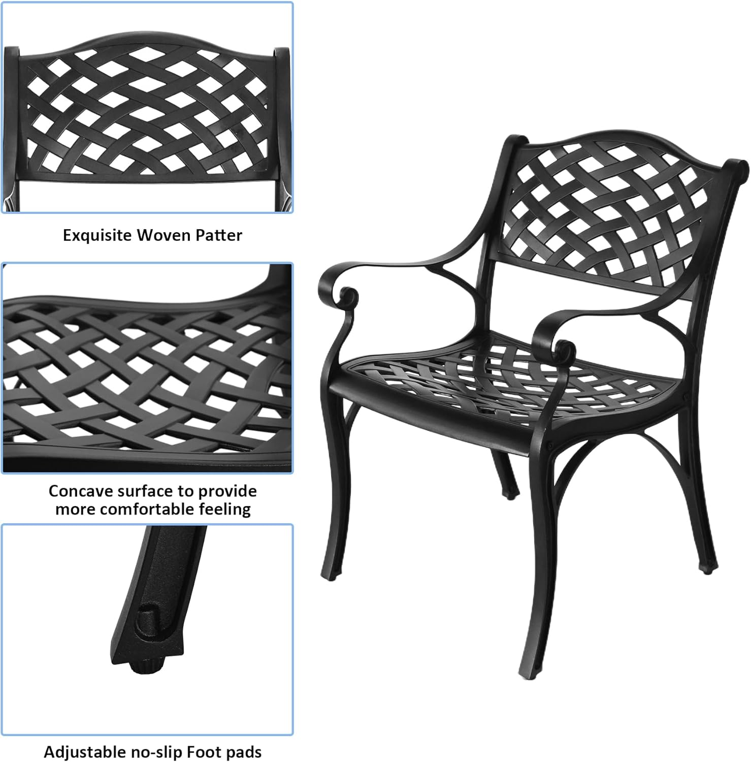 - Widly Occassion: This cast aluminum patio dinning set is with fashional woven design, which come with any stylish patio. Outdoor table and chairs takes you on a relaxing holiday in deck, yard, balcony, garden, lawn, front porch, pool.