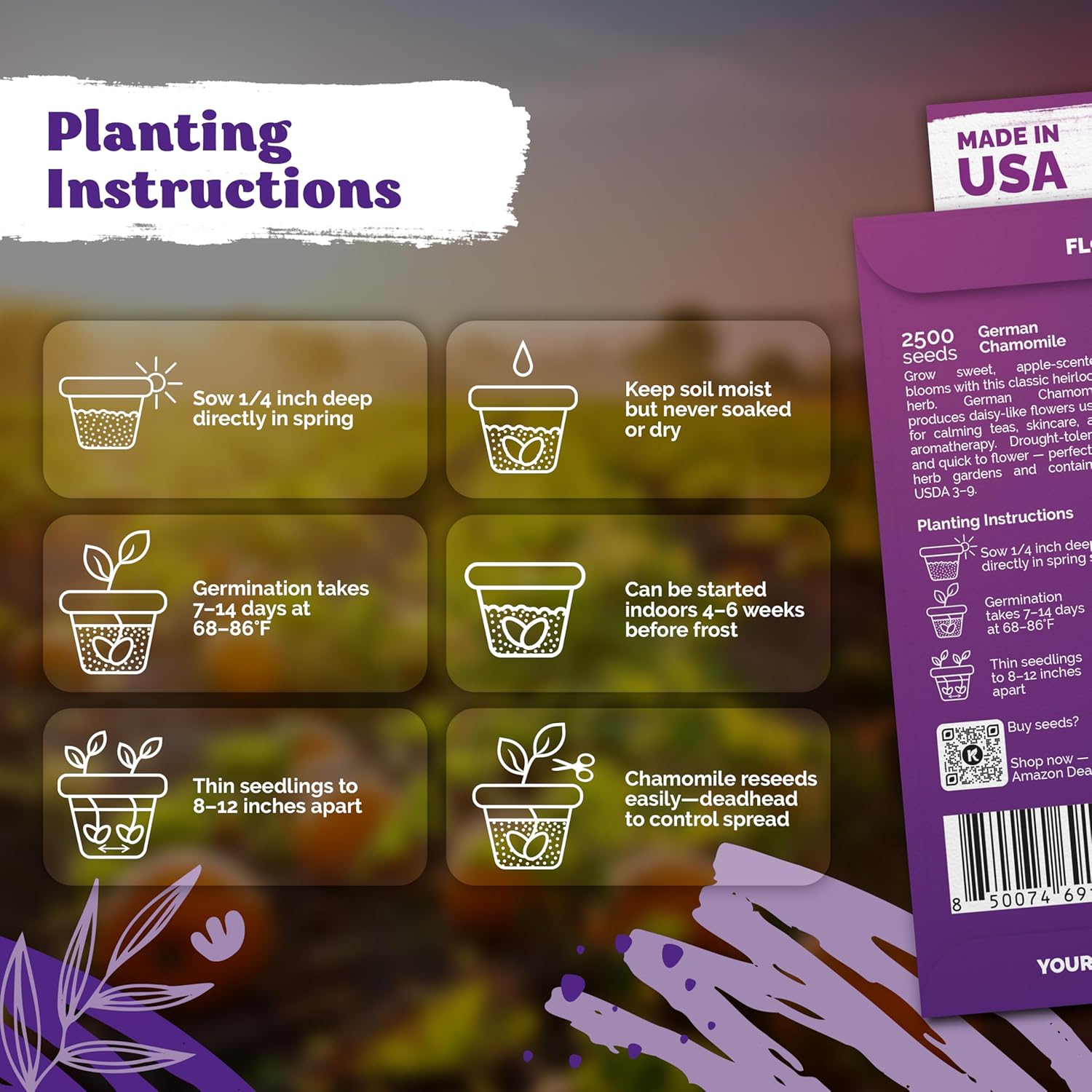 - Low‑Maintenance Beauty: German chamomile reseeds and needs watering only when soil is dry 2 in deep; space 8‑12 in apart for hardy plants thriving in sun or partial shade, attracting pollinators.