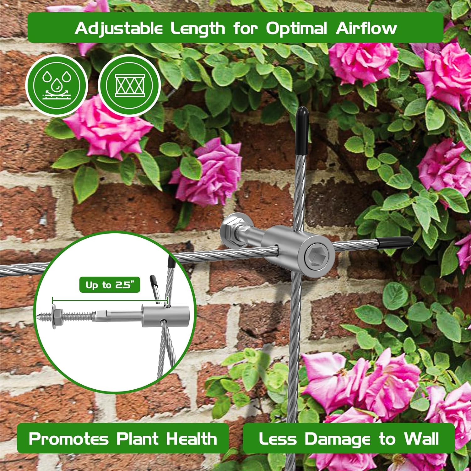 - 「Enhanced Airflow for Plant Health」- The 2.5-inch gap from the wall after installation is designed to prevent moisture buildup, keeping everything fresh yet dry and improving airflow around your plants. This trellis wire kit enhances their health and provides a perfect environment for climbing plants. The 7 x 7 stainless steel cable not only looks great but also provides a reliable surface for plants to grip and climb