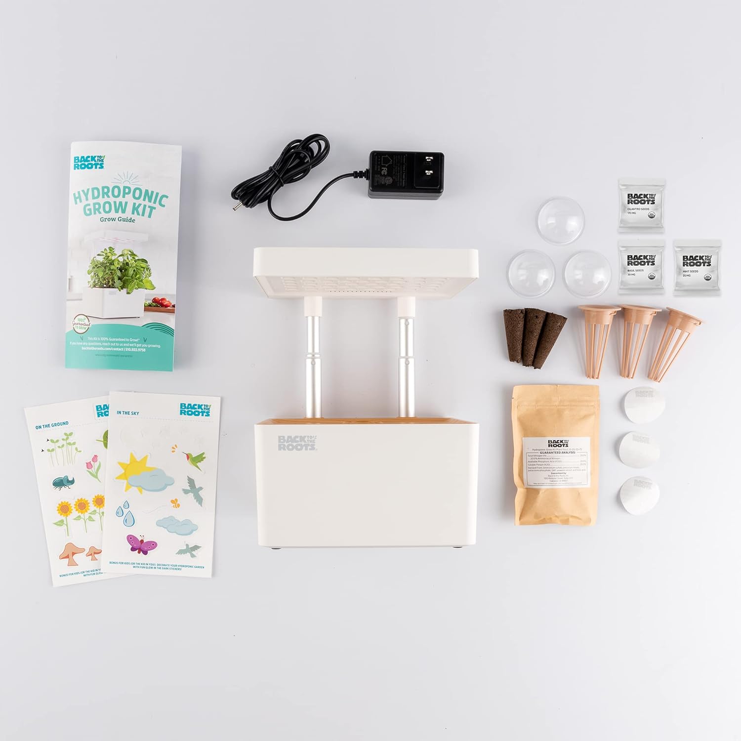 - COMPLETE COUNTERTOP GARDEN: This hydroponic system comes with everything you need to grow. Inside is a 3-pod grow system, automatic LED light, telescoping poles, grow medium, humidity germination domes, water level indicator, easy to use pre-portioned plant food, STEM gardening curriculum, fun stickers for kids, and a 100% Guaranteed to Grow promise! And the best part? It's made using recycled plastic β over 60 water bottles worth!