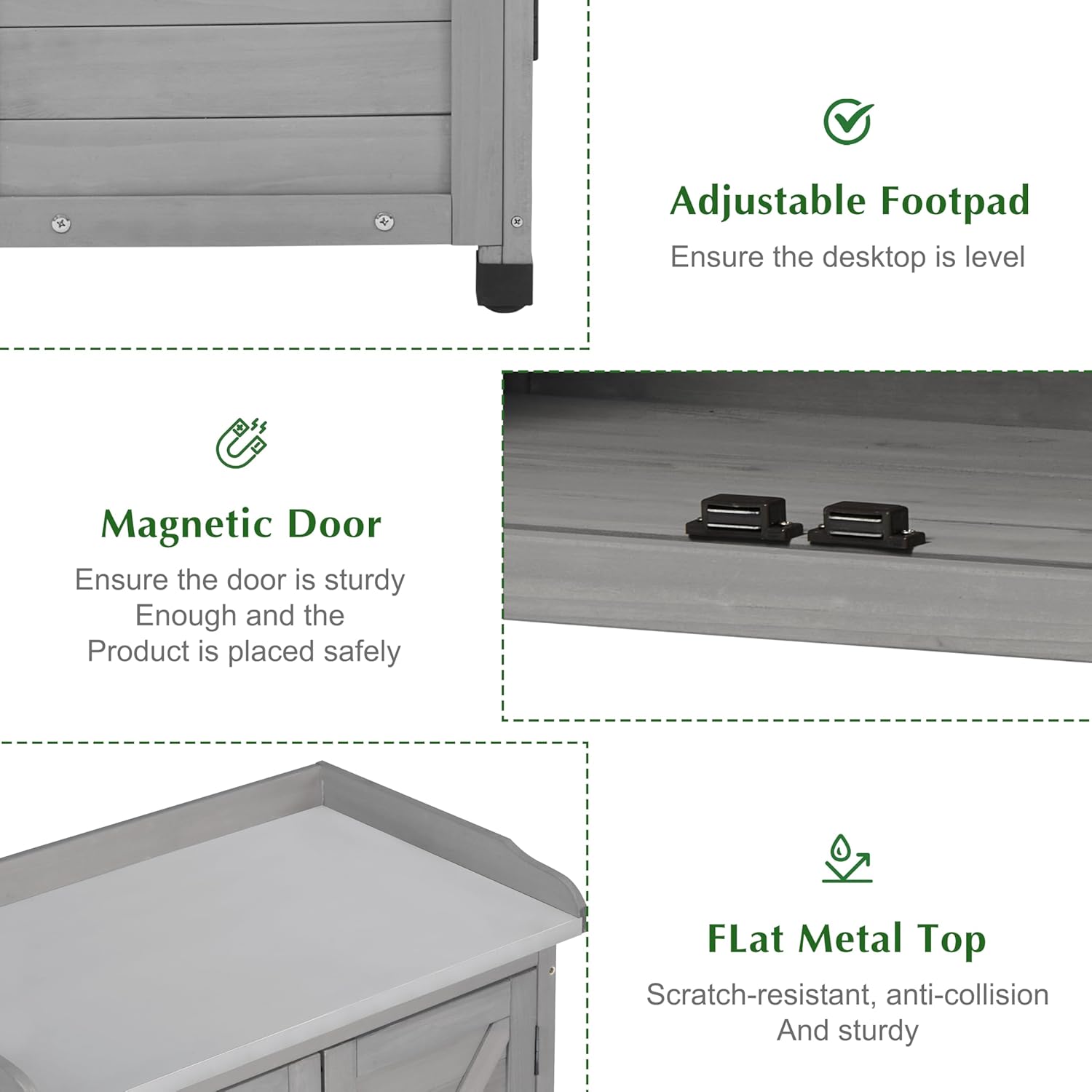 - 【PATENTED FARMHOUSE DESIGN】 Our storage cabinet and potting bench table is made from premium cedar wood with water-based gray coating, designed for classic farmhouse style with US. Patent application