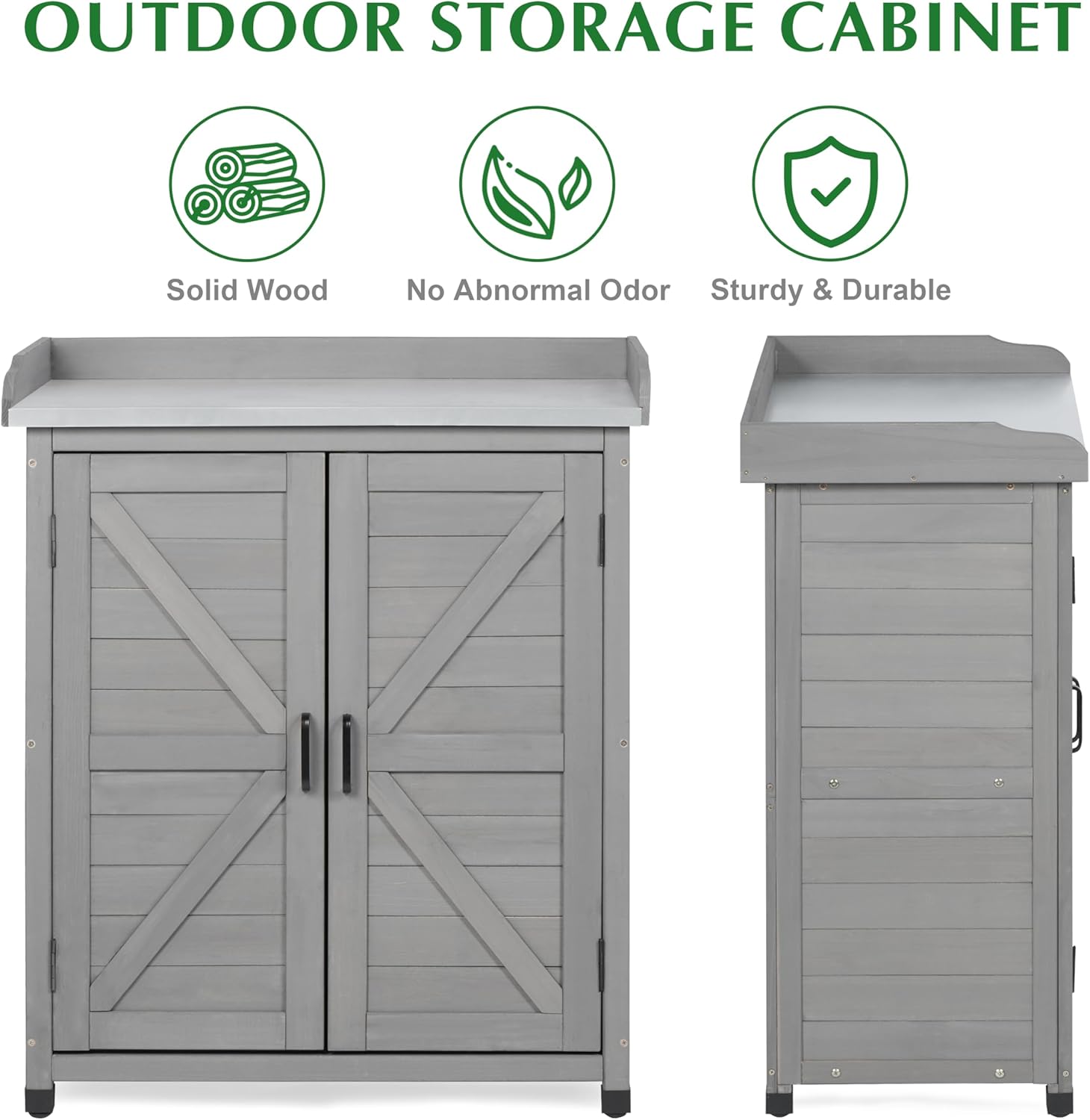 Outdoor Storage Cabinet & Potting Bench Table with Metal Top, Wooden Patio Furniture, Garden Workstation (Classic Grey, 39x31.5x17in)