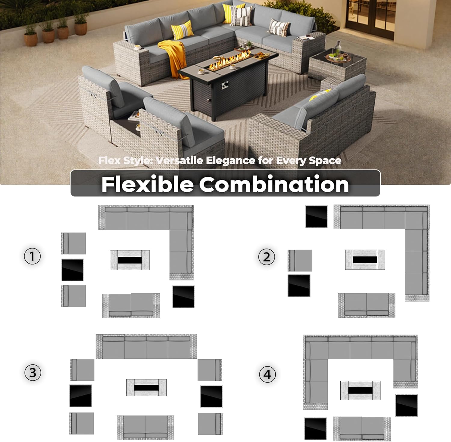 ovios 13 Pieces Patio Furniture Set, Outdoor Wicker Sectional Sofa with 54 Inch Fire Pit Table Comfy Cushions, Modern Modular Deep Seat Rattan Couch Conversation Set, Dark Grey