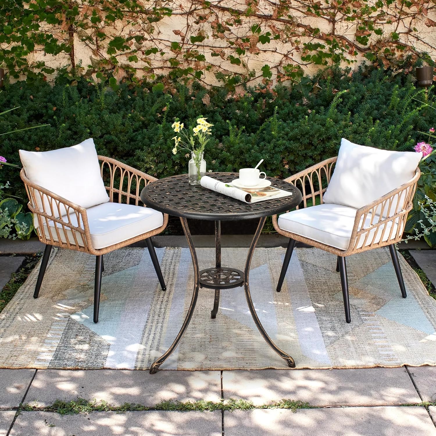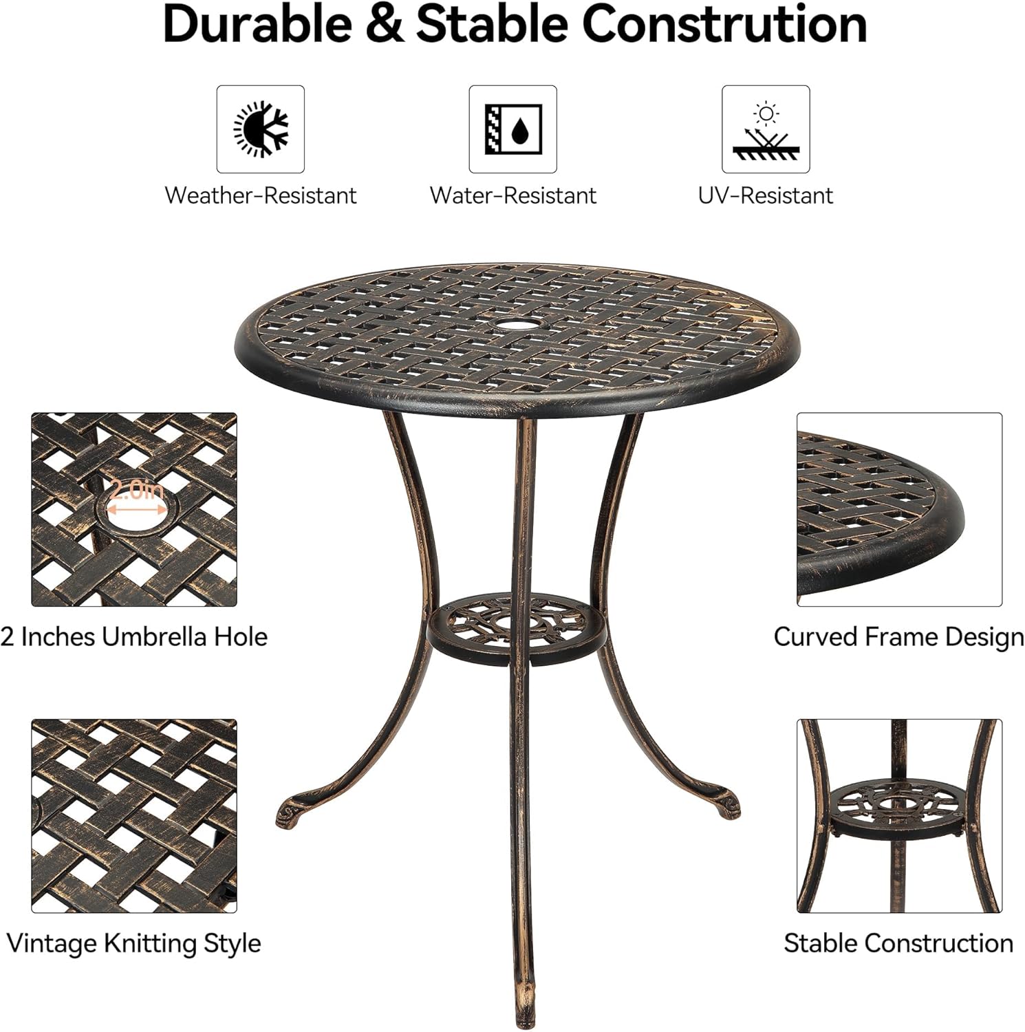- ăDurable & Weather-Resistant Constructionă: Constructed from high-quality cast aluminum, this Round patio bistro table is designed to withstand harsh outdoor conditions. It offers exceptional durability, weather resistance, and rust preventionâensuring long-lasting performance with minimal maintenance required.
