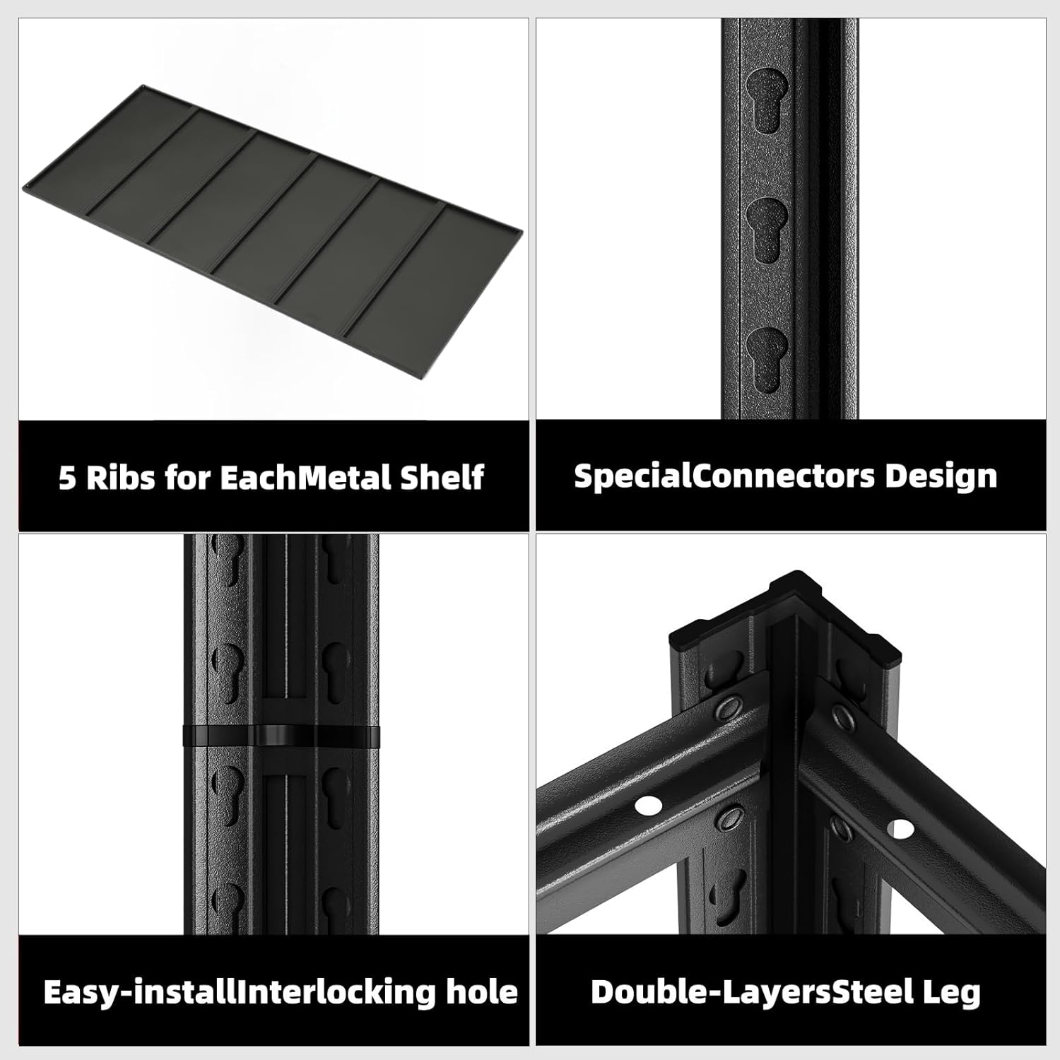 - 【Sturdy and Durable Garage Shelves】Garage shelving is made of premium metal and feature double-thick legs and a rust-resistant coating for added durability.No wobbling or shaking when fully loaded as one-layer vertical support bar will help distribute the pressure and increase the overall stability.The metal shelving will hold your merchandise better and remain stable. This stable storage shelves will serve you for many years and is ideal for storing heavy items