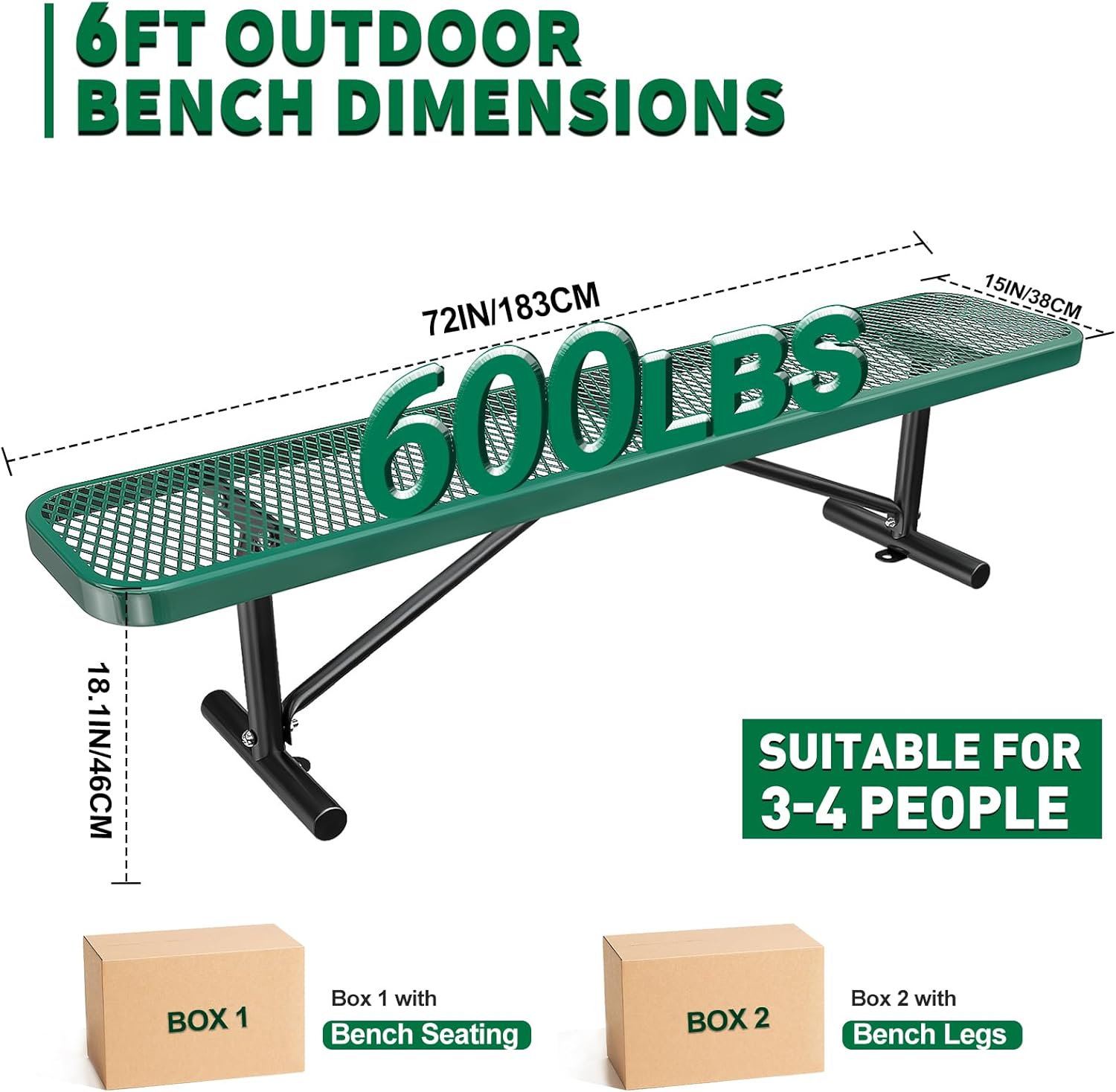 - Superior Craftsmanship: This 6 FT heavy duty park bench, sized at 48"-96”L x 23.2”W x 32.5”H, comfortably accommodates 2-7 people. Featuring a mesh cut-out design on the seat, it ensures both comfort and reduced weight, while stabilizing triangular supports provide a smooth seating experience.