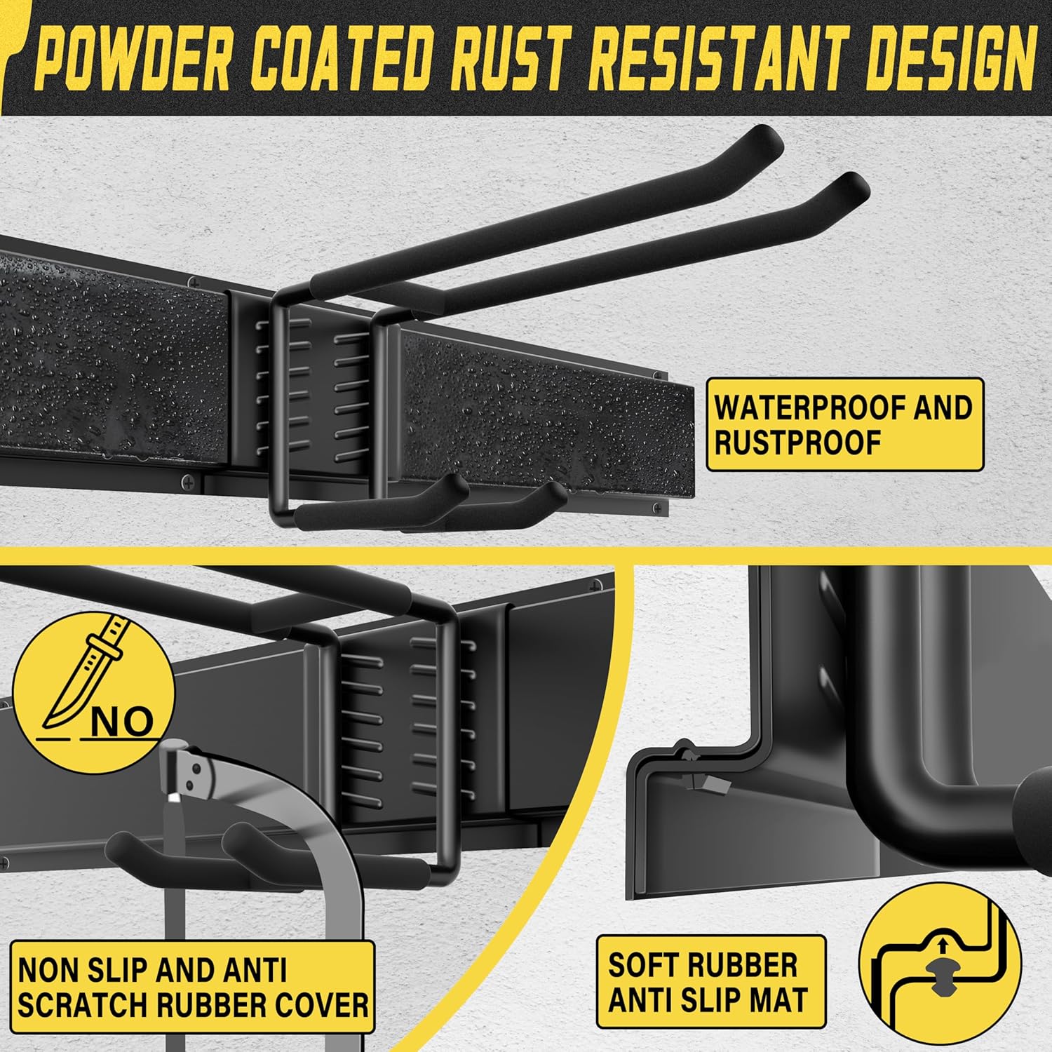 - IMPROVED DESIGN:Yard Tool Organizer for Garage.Double Upper Hooks:Wider Spacing to 2.48 inches.Double Lower Hooks:Wider Spacing to 2.52inches.Fulfills More Hanging Needs.Equipped With 6 Hooks(6 Double-Layer Hooks,3 Nylon Taping) and 3 Rails.