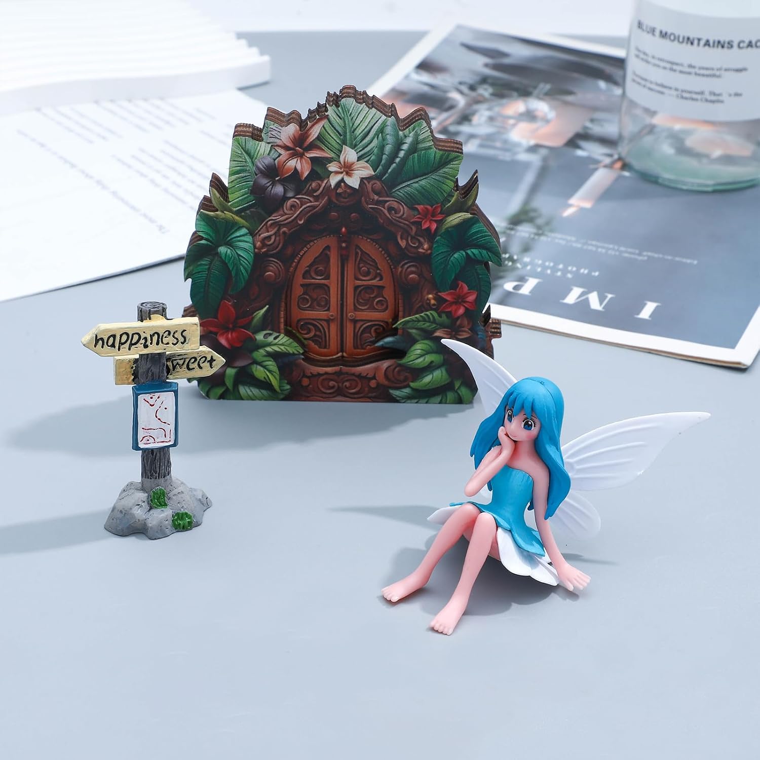 - What you get: a fairy door, 4 pieces of fairy figurines, a sign board, a good combination for garden decorations