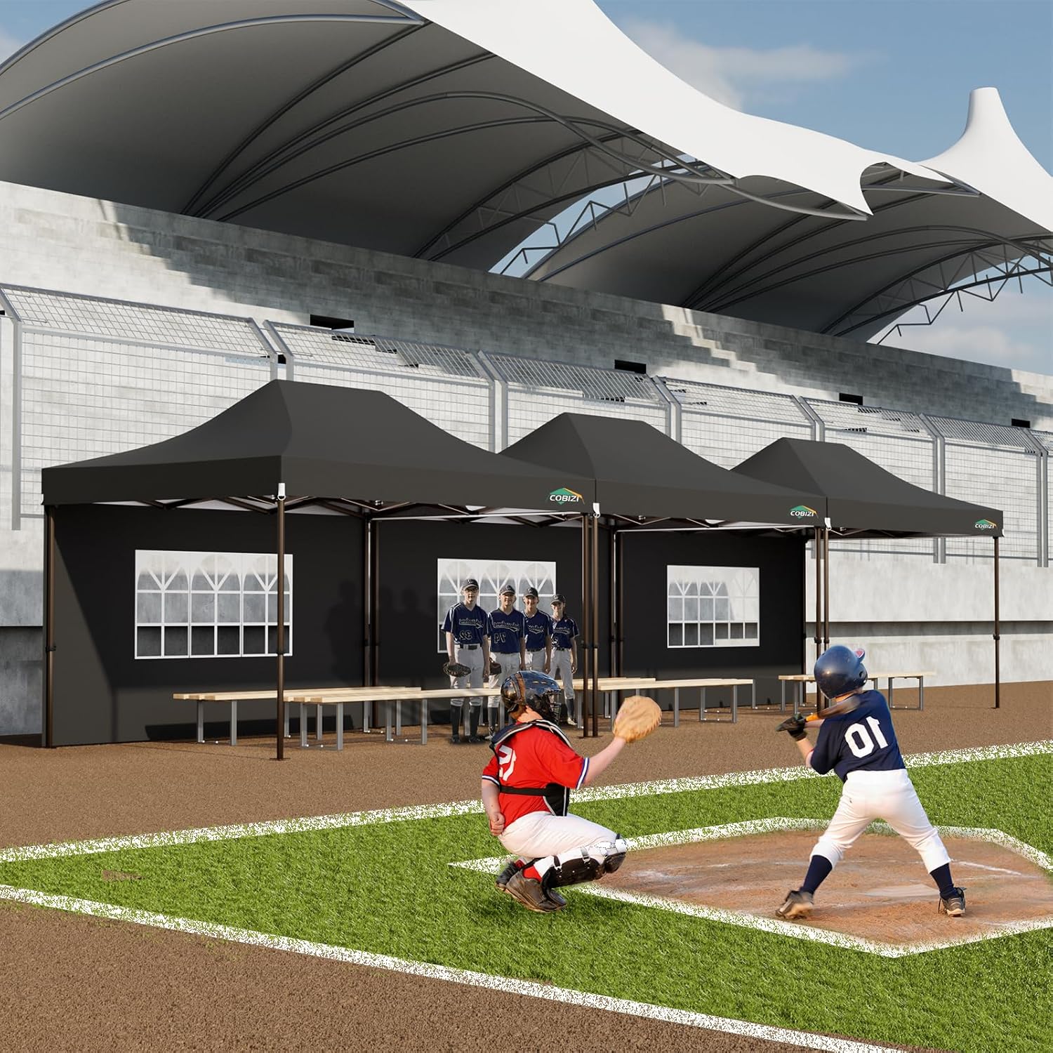 - [Upgrade Heavy Duty Canopy] The COBIZI 10x15 Heavy Duty Canopy features a commercial-grade full truss structure constructed from durable powder-coated stainless steel. The thickness of the 1.77 inch (45mm) hexagonal legs has been increased to 0.7mm/0.03 inches, providing superior stability and durability. Full truss design ensures exceptional sturdiness and rust resistance, capable of withstanding wind speeds of up to 30mph when properly secured with an number of sandbags, ropes, and stakes.
