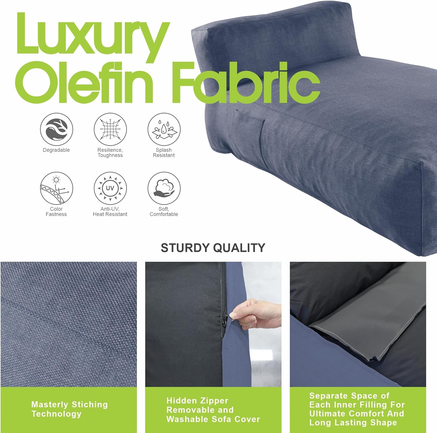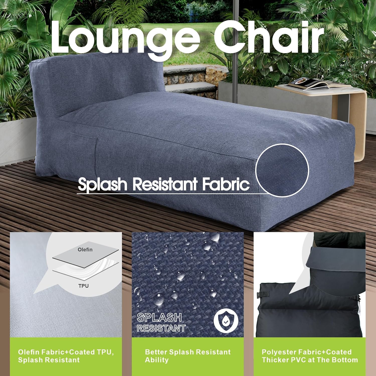 - Premium Olefin Fabric – Water Repellent, UV Resistant, and Durable - Made with high-performance olefin fabric, this lounger resists splashes, fading, and UV rays while remaining breathable and soft. Olefin is known for its color fastness, heat resistance, and eco-friendliness, making it the ideal material for outdoor lounge furniture that looks good and holds up season after season.