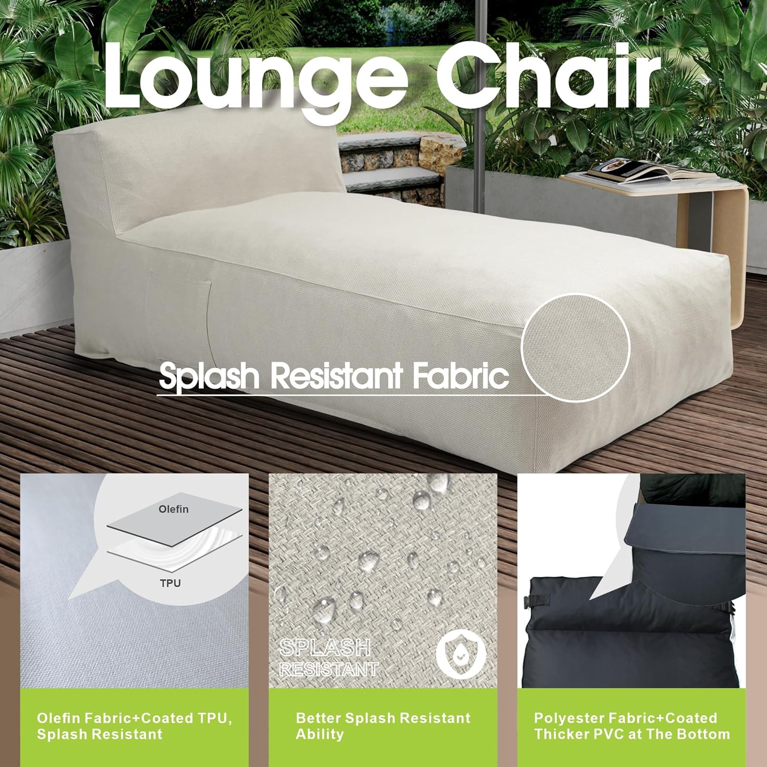 - Premium Olefin Fabric – Water Repellent, UV Resistant, and Durable - Made with high-performance olefin fabric, this lounger resists splashes, fading, and UV rays while remaining breathable and soft. Olefin is known for its color fastness, heat resistance, and eco-friendliness, making it the ideal material for outdoor lounge furniture that looks good and holds up season after season.