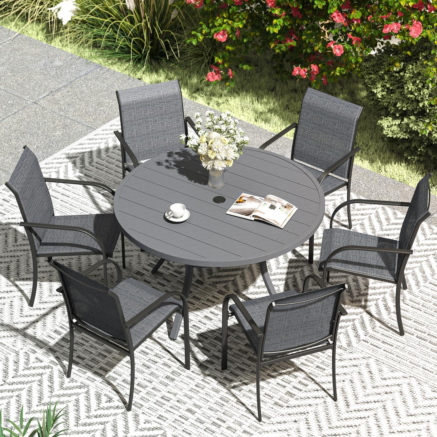 VICLLAX Patio Dining Set for 6, Outdoor Furniture Set Includes 47.2" Round Patio Table and 6 Patio Sling Chairs, Grey Tabletop and Grey Fabric