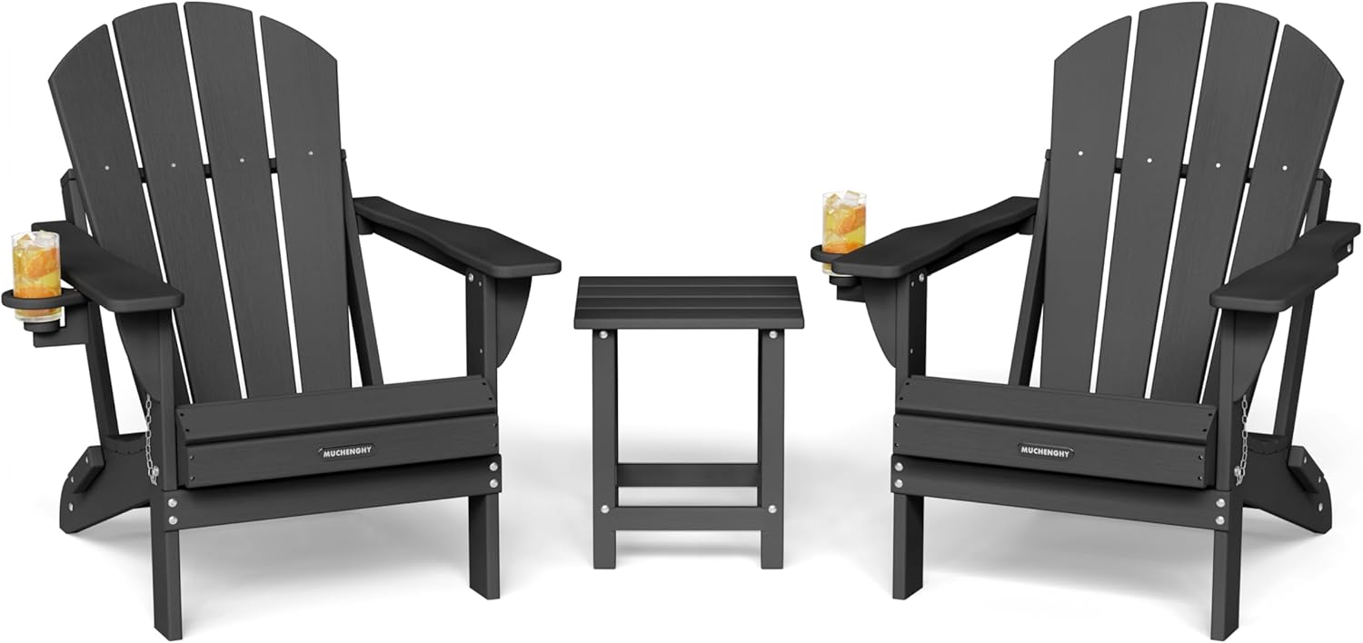 MUCHENGHY Folding Adirondack Chairs and Table Set, Outdoor Chair, Adirondack Chair Plastic, Fire Pit Chair, Weather Resistant with Cup Holder for Deck, Backyard, Garden(Black, 3-Piece)