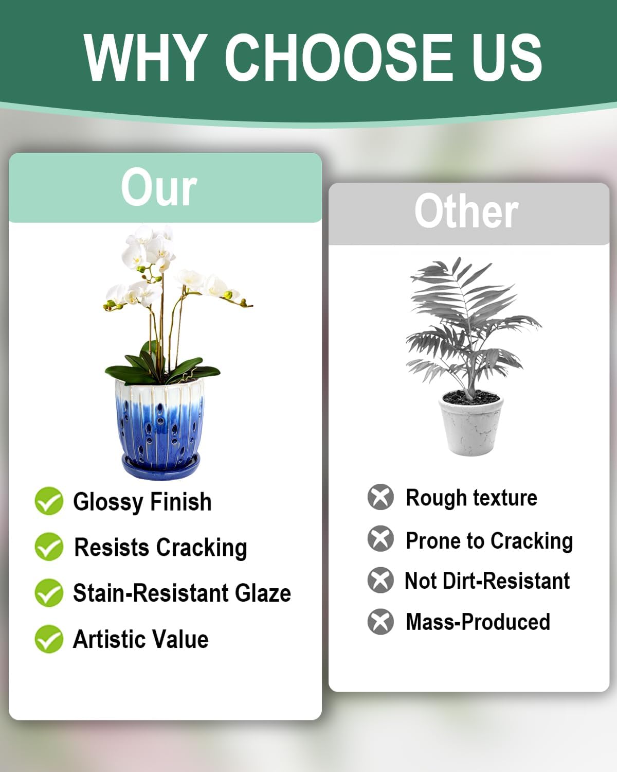 vensovo 6 Inch Ceramic Orchid Pot - Orchid Pot with Holes for Repotting, Ceramic Planter with Saucer for Indoor/Outdoor Plants, Blue