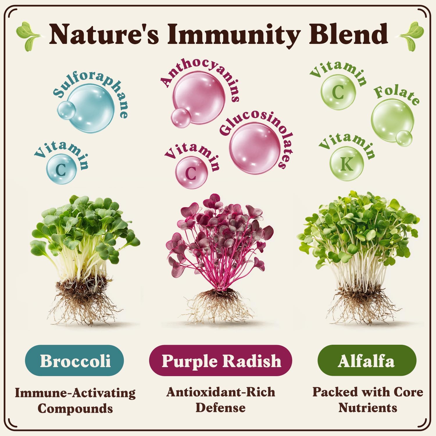 - Sprouts or Microgreens—No Garden Needed - Grow crisp, fresh greens anywhere—whether in a tiny apartment, busy workspace, or on the go. Sprout our Organic Immune System Booster Blend in a jar for a crunchy, nutrient-rich addition to meals, or grow longer in a tray for heartier microgreens with bold flavor. Alfalfa, Broccoli, and Purple Radish for planting are ideal for health-conscious individuals seeking a quick, nutritious upgrade to smoothies, sandwiches, salads, and more..