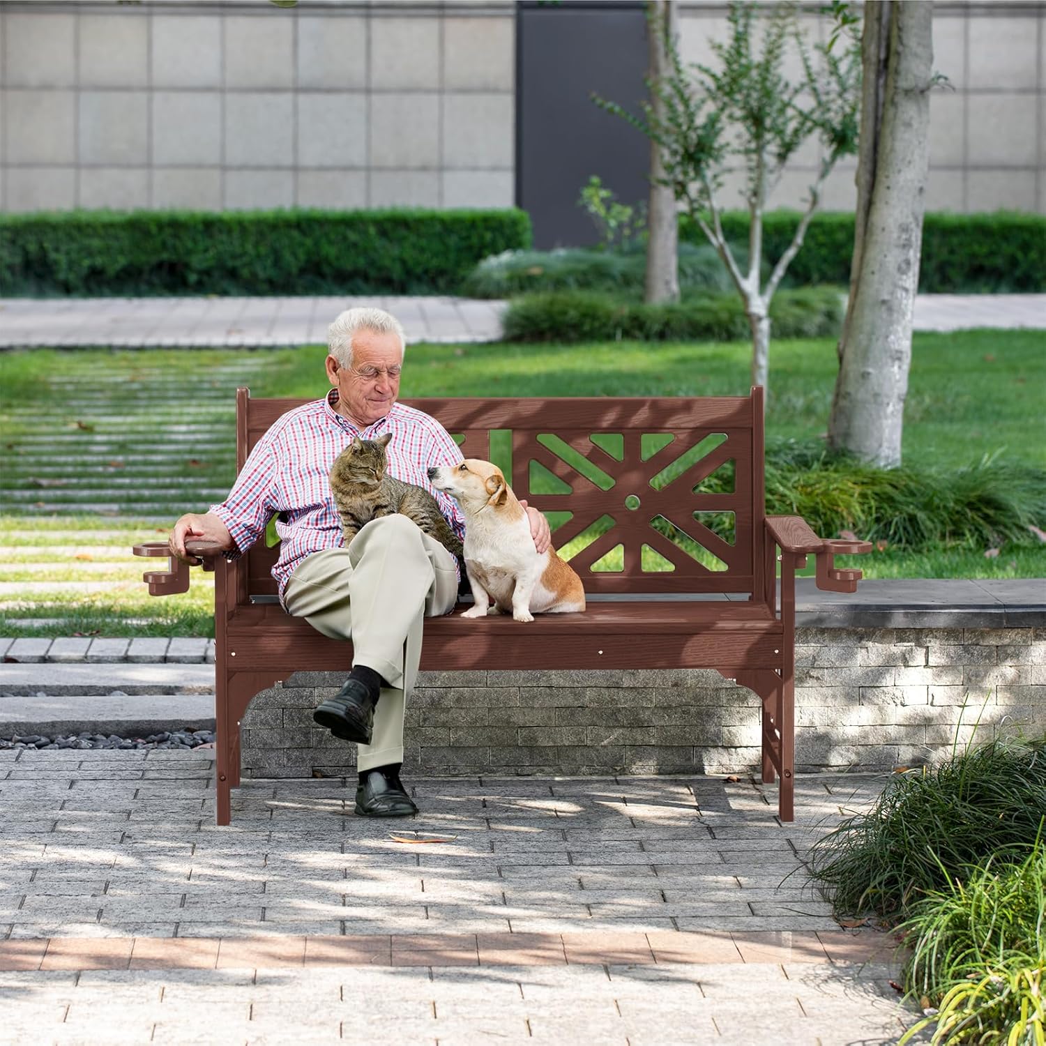 nalone Outdoor Bench with Cup Holders, HDPE All Weather Porch Bench Load up to 800 Lbs, 2-Person Garden Benches Rot-Proof Fade Proof for Patio, Porch, and Park (Brown)