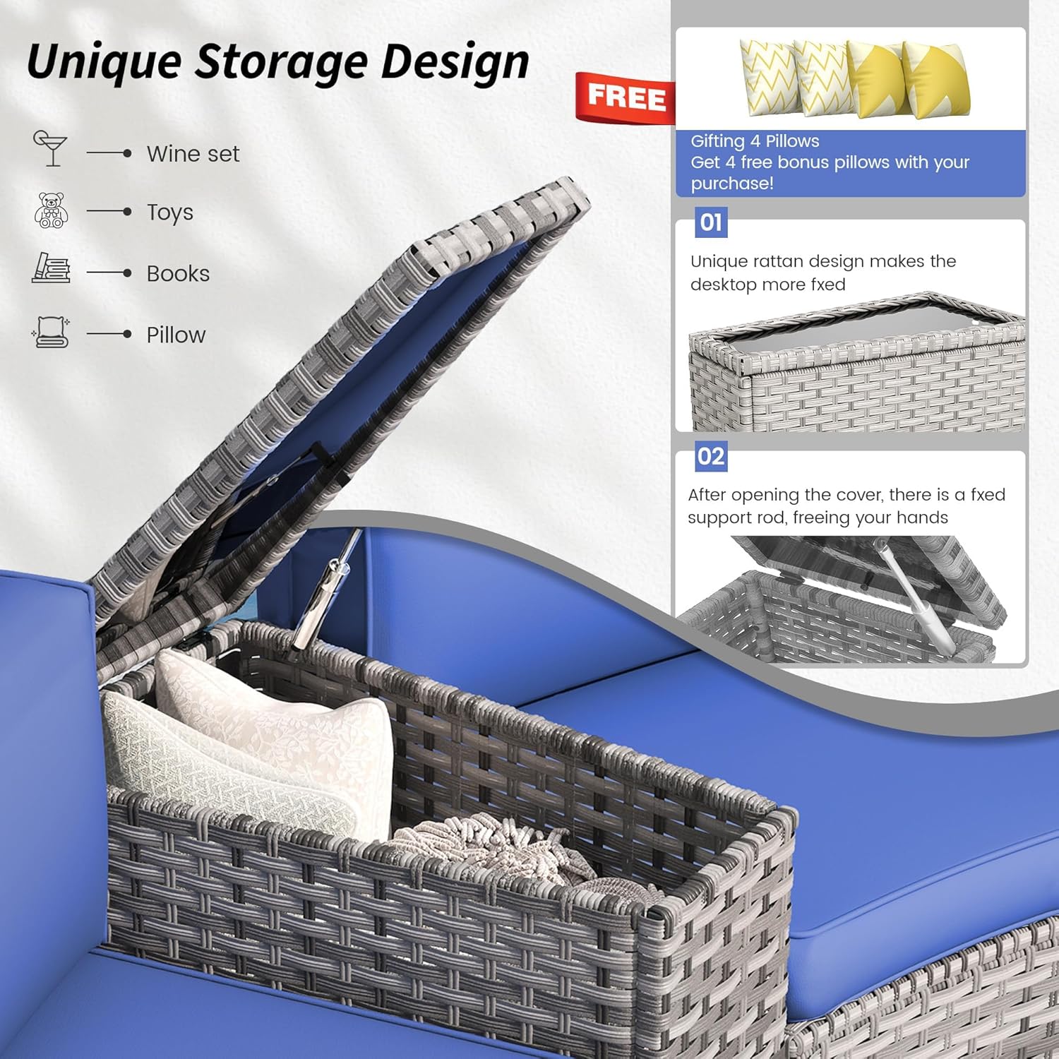 Patio Sectional Furniture Outdoor 11-Piece Grey Rattan Curved Sofa Set with Storage Table, Pillows, Fit for Pool Backyard Balcony Porch Lawn (Navy)