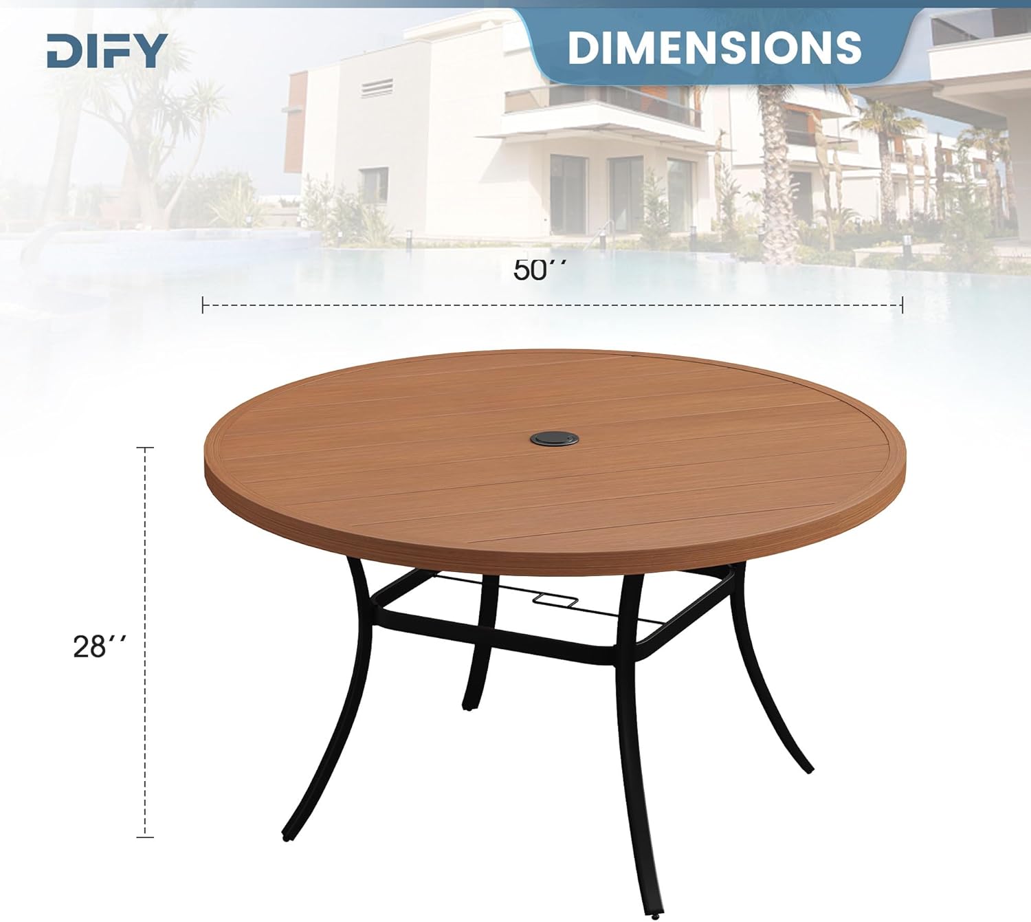DIFY 50" Round Outdoor Patio Dining Table for 6, Metal Patio Table with 1.57" Adjustable Umbrella Hole, All-Weather Dining Furniture Table for Backyard Lawn Garden, Walnut