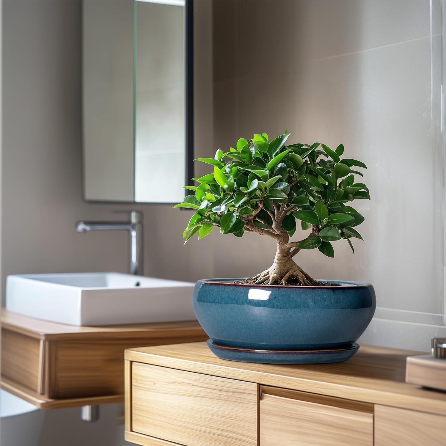 SQOWL Bonsai Pots 10 Inch - Large Ceramic Succulent Pots, Shallow Planter with Drainage Hole and Saucer, Round Planter for Indoor Outdoor, Bowl Planters, Patio Decor, Gifts for Plant Lover, Blue
