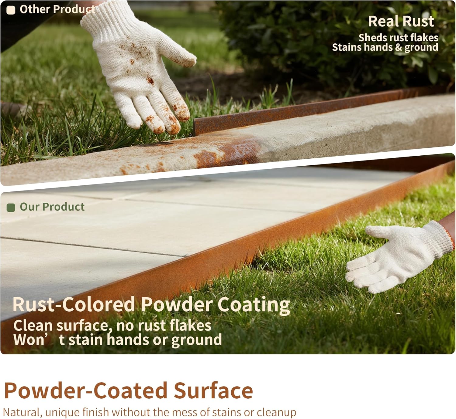 - Rust-Colored Powder Coating – Rust-Colored powder coating offers the charm of natural rust without shedding particles or staining the ground.