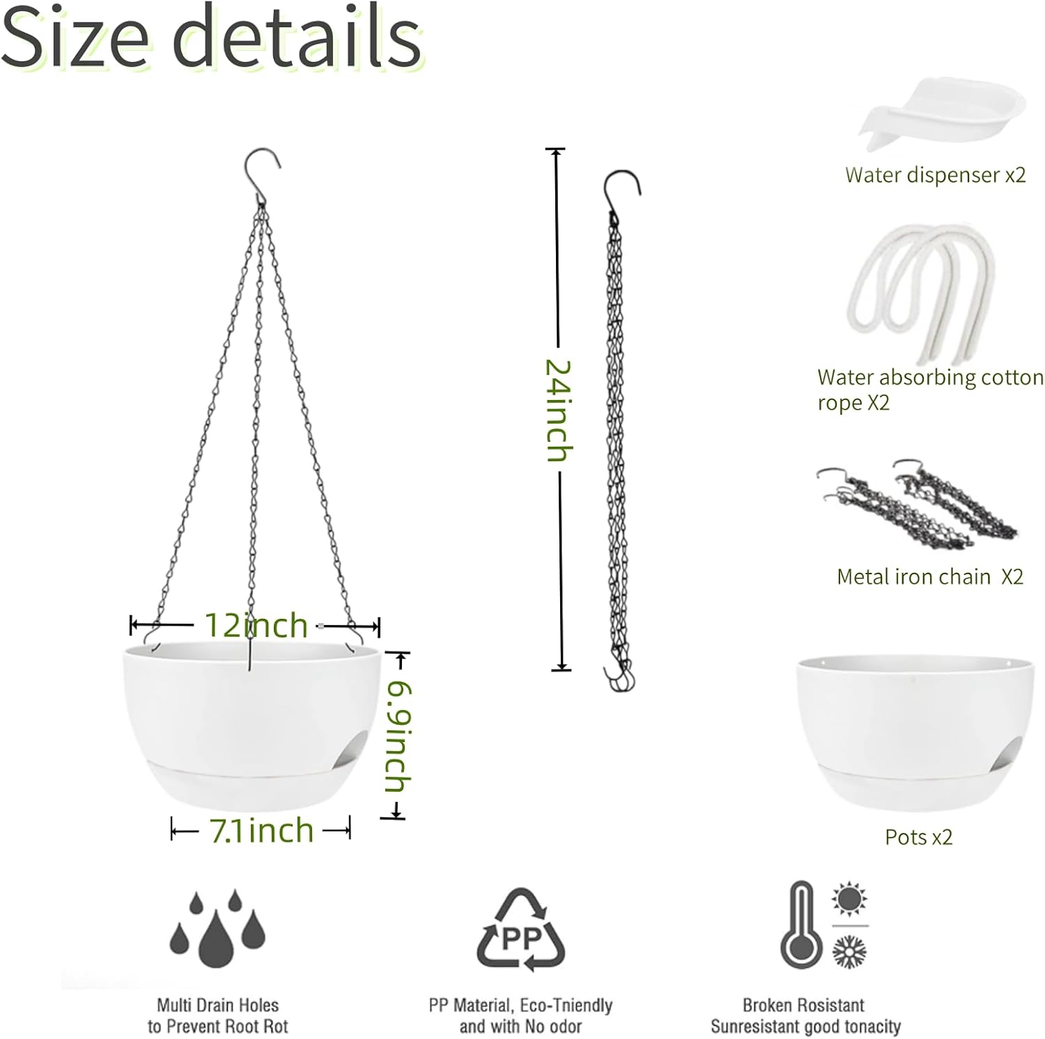 2 Pack Hanging Planters for Indoor Outdoor Plants, 12Inch Self Watering Hanging Pot with Drainage Holes and Saucer, Plastic Plant Pots, White Flower Pots for Kitchen, Balcony, Garden