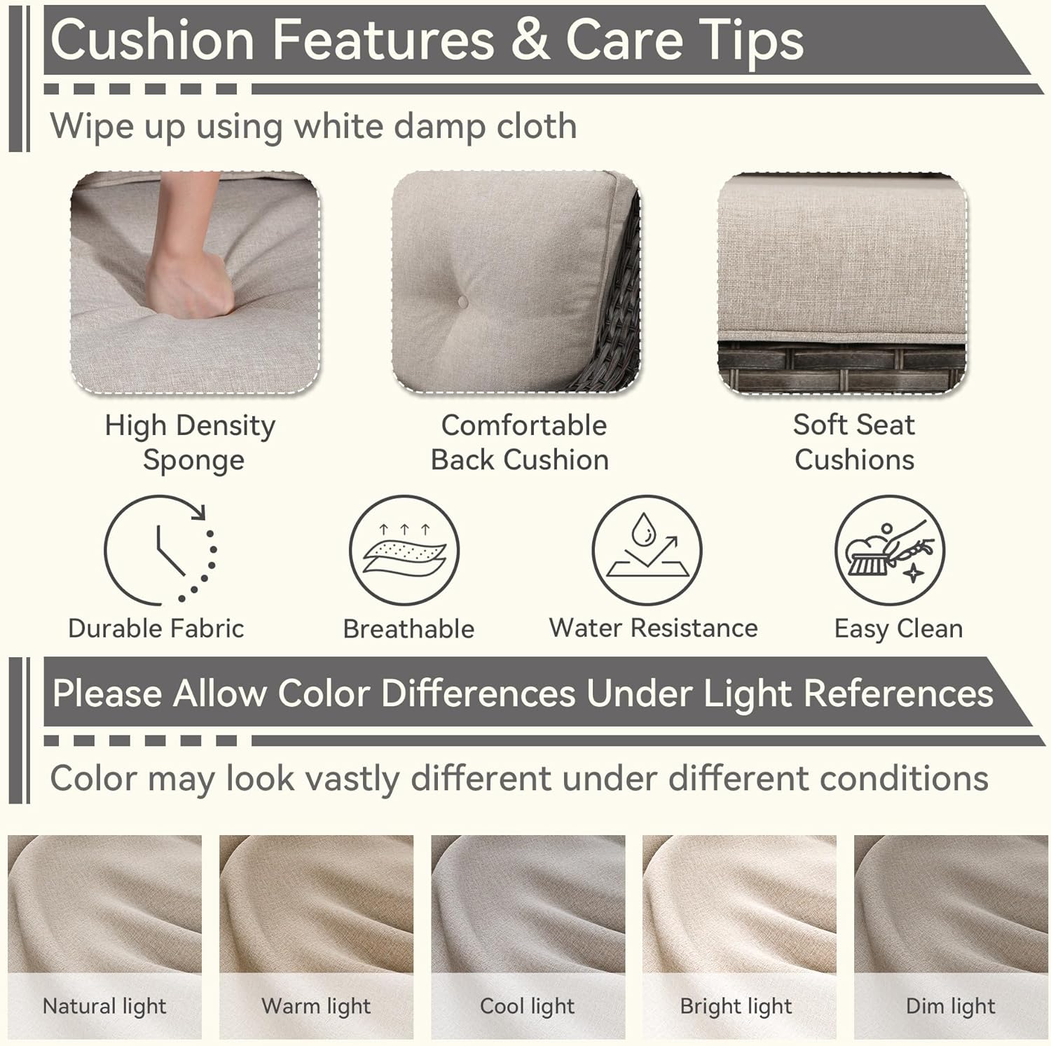 - [Easy-Clean Cushions] Wipe with a white damp cloth for easy clean. Allow for color differences in different ambient light and displays