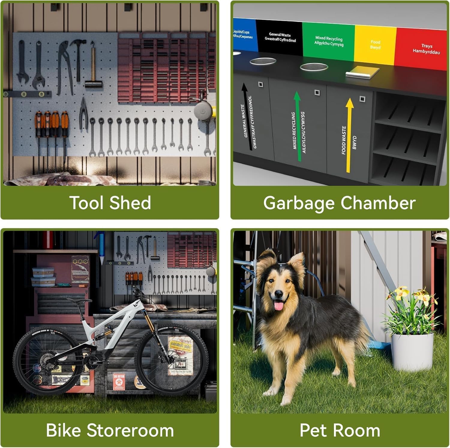 - Outdoor Shed:This storage shed is made of high-quality galvanized steel and covered with a powder-coated finish.Its durable construction ensures that it can withstand harsh weather conditions and ensure your items remain safe