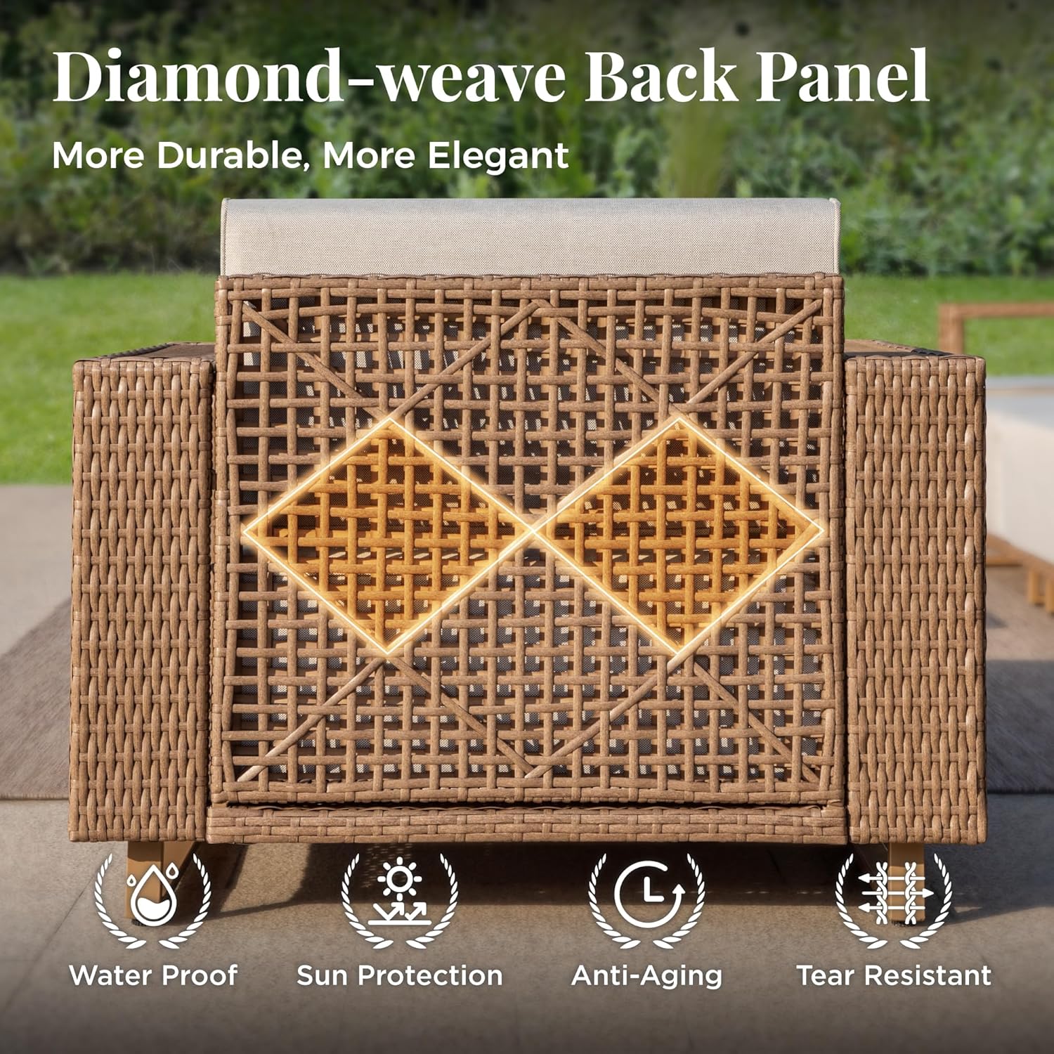 - Widened Armrests and Diamond-Patterned Backrest Design: This sofa combines comfort and style. It features 5.5-inch thick rattan armrests for extra support, making relaxation more enjoyable. The wide armrests allow for easy leaning, while the diamond-patterned woven rattan backrest adds a touch of elegance to the overall look