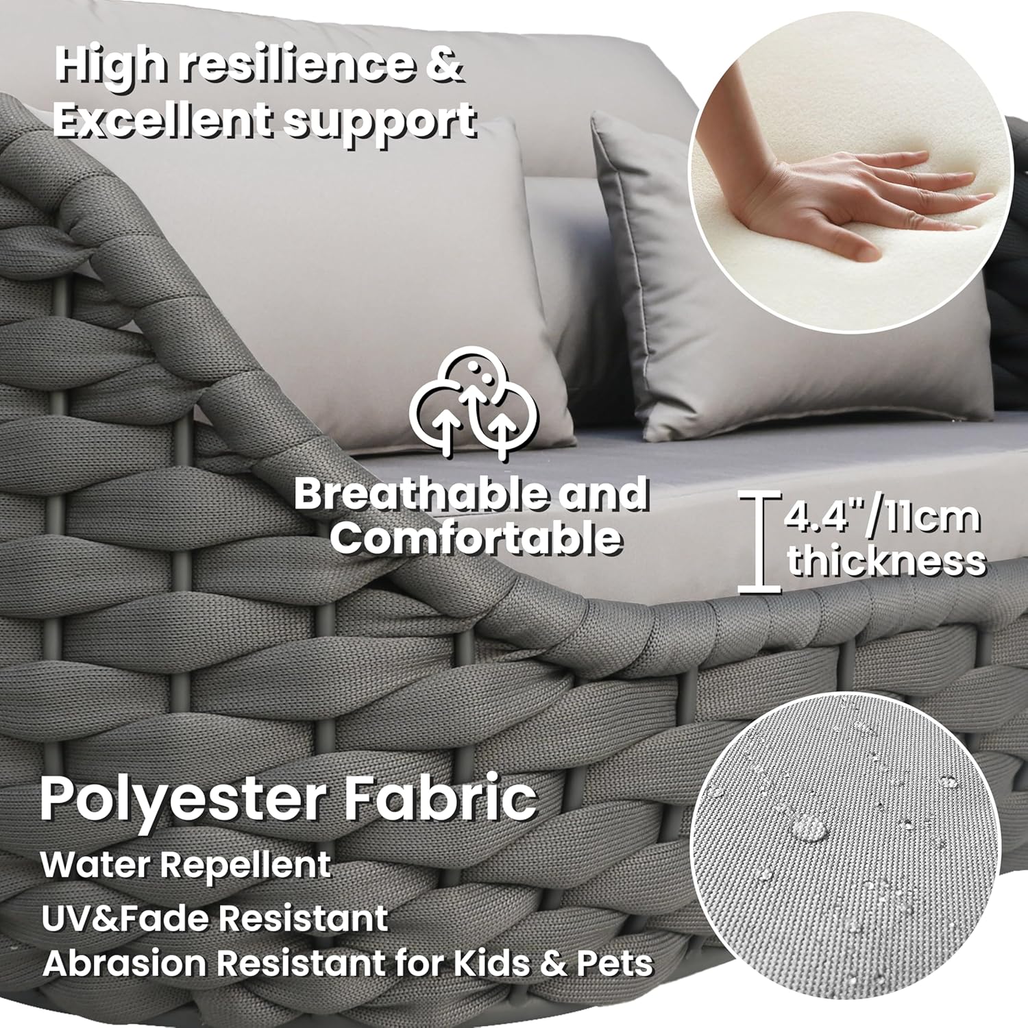 - Outdoor rated polyester ropes resist UV rays, water and temperature changes. Foam interior offers a plush touch. Crafted from reinforced rust-free aluminum alloy frame, the 4-piece all-weather patio conversation set resists to UV, rain, wind, saltwater. Perfect for indoor outdoor even arid or coastal areas