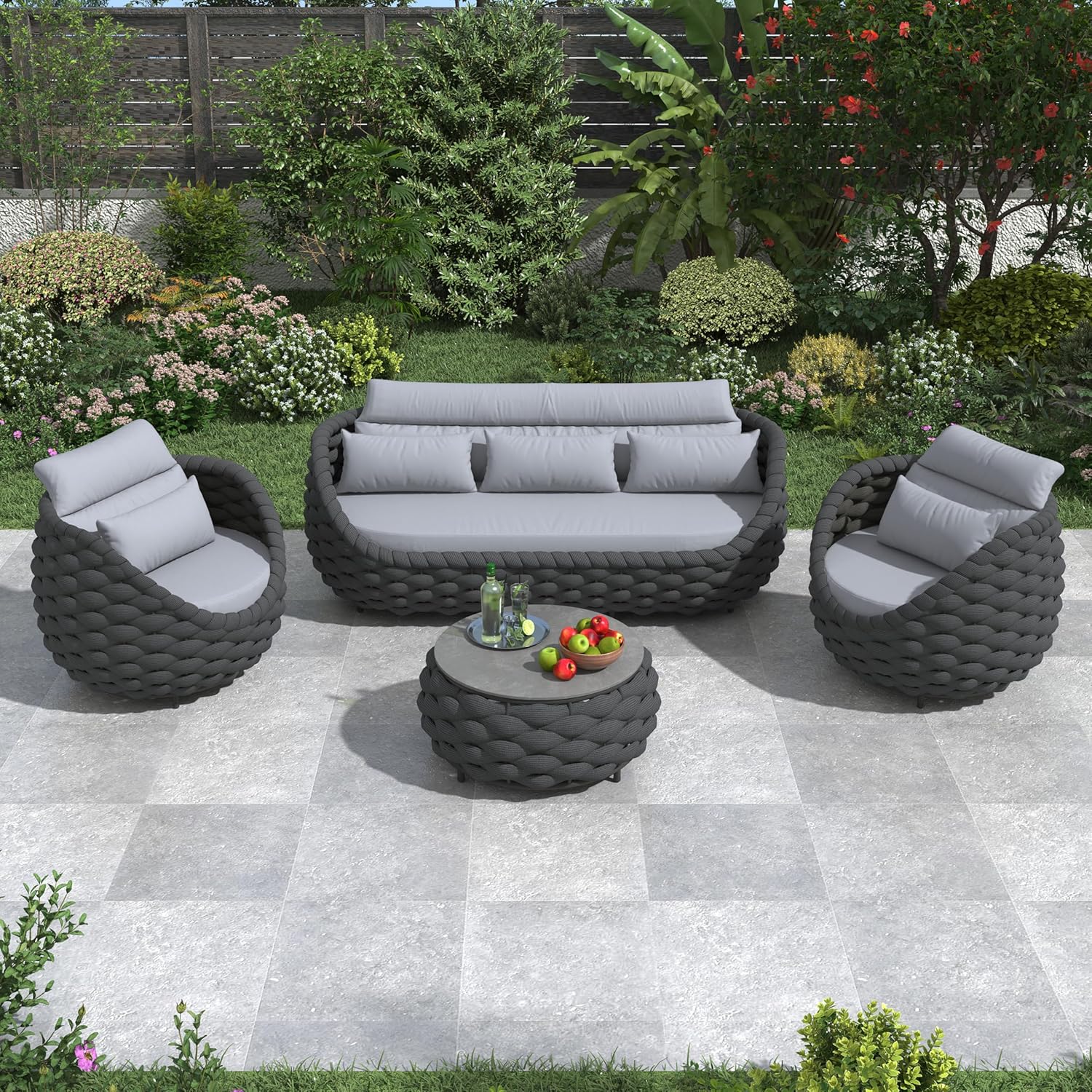 - Inspired by bird's nest shape, the curved scoop armrest, supportive backrest and deep cushioning of Erotr assembled cushioned patio sofa set hugs your body for ultimate relaxation. Knitted-like rope fabric gives warm comfy looking. Rounded edges reduce the risk of bumps or scrapes for children and pets