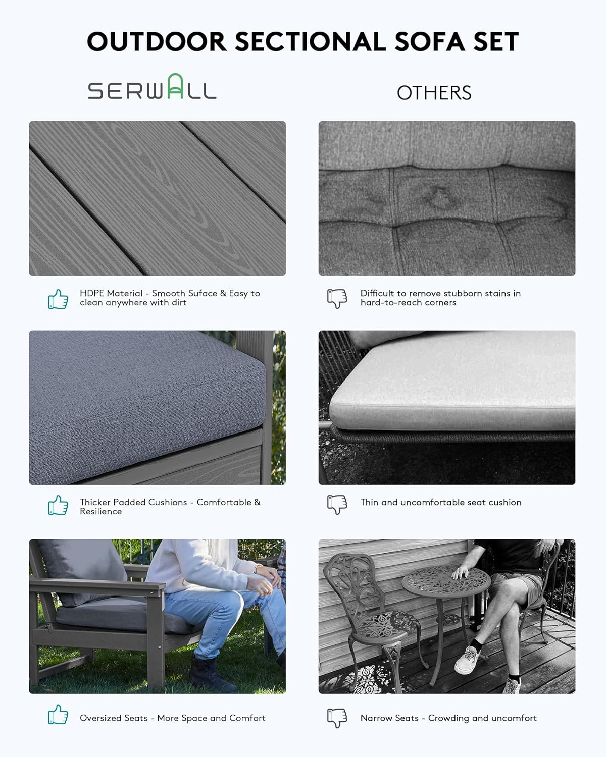 - Exceptional Durability & All Weather: Crafted with HDPE material, this outdoor sectional sofa is built to last, withstanding the test of time and heavy use, each seat can hold up to 360LBS. The weather-resistant HDPE material ensures that this sofa can withstand various weather conditions, making it perfect for outdoor use.