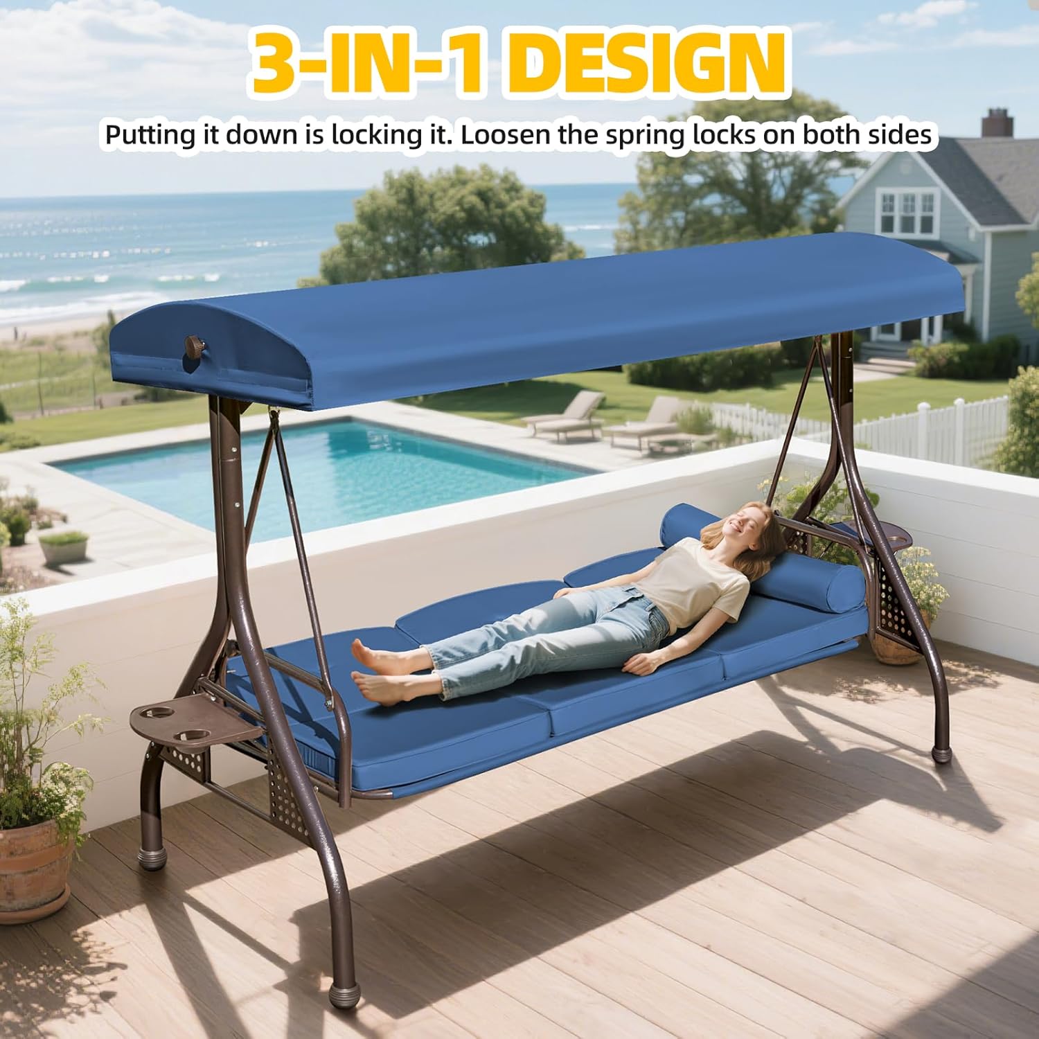 3-seat Patio Swing with Canopy,Convertible Outdoor Swing Bed with Thick Cushions, Pillows & Cup Holders, 3-Seat Outdoor Swings Chair for Backyard, Garden, Deck(Blue)