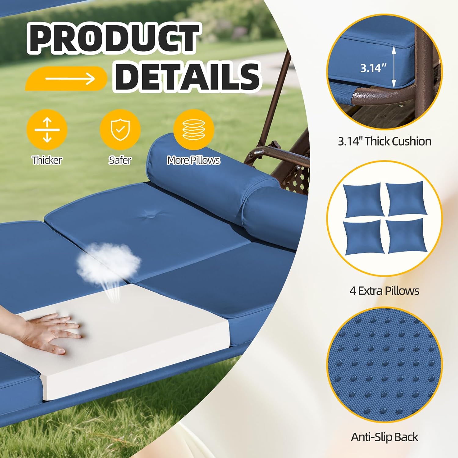 - Anti-Slip Cushion Design for Extra Comfor: Listening to customer, we've upgraded our outdoor swing cushions! The seat cushion now features a bottom layer of rubber anti-slip dots to reduce unwanted sliding and keep your cushion securely in place — even when the swing moves. The thick 3.6-inch cushion, filled with high-resilience sponge, and two headrest pillows provide exceptional comfort and neck support