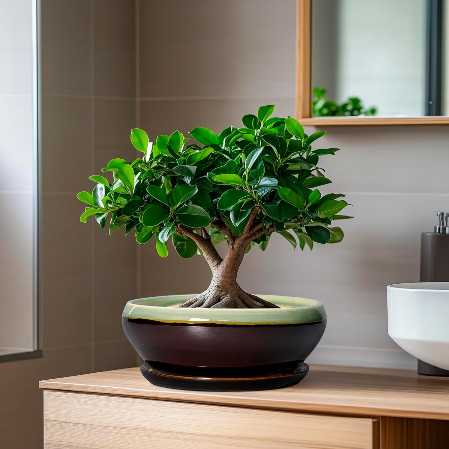 SQOWL Bonsai Pots 8 Inch - Ceramic Succulent Planters with Drainage Hole and Tray, Round Shallow Planter for Indoor Plants, Ceramic Planter Bowl Outdoor, Living Room Decor, Garden Gift, Green-Brown