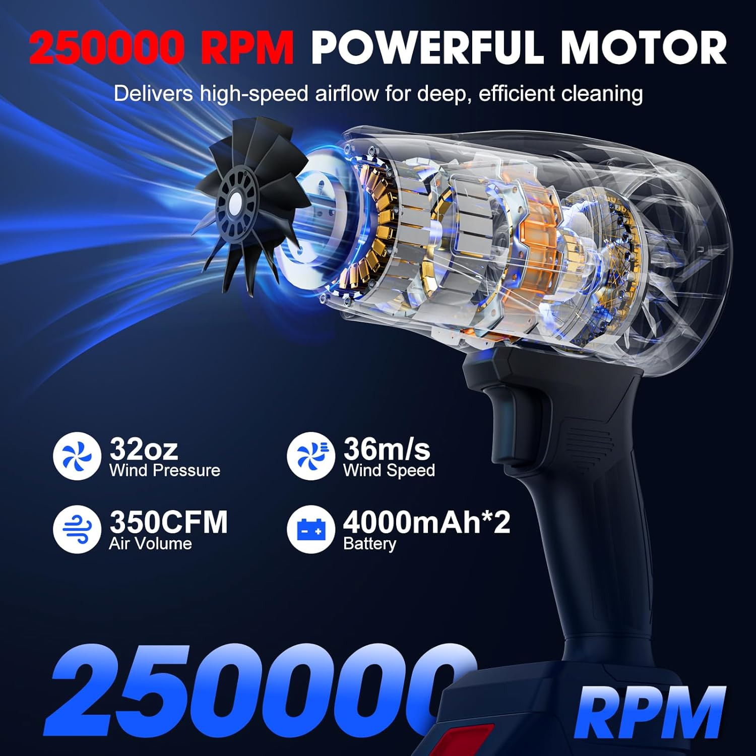 - Powerful Cordless Leaf Blower: This electric leaf blower is designed with a high-speed turbine motor and alloy air blades, with a rotational speed of up to 250000RPM, cordless blower generating a high-speed airflow of more than 36m/s, making it perfect for clearing leaves, dust, and debris.