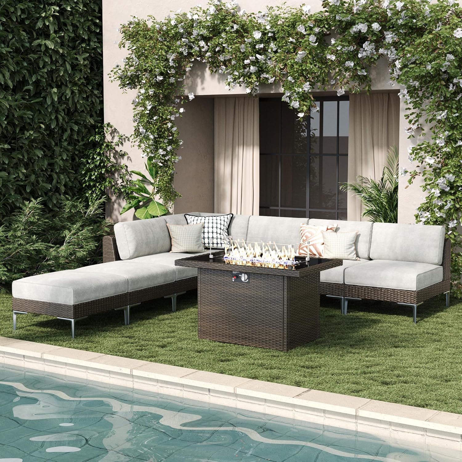 LayinSun 7-Piece Outdoor Modular Wicker Sectional Sofa with Fire Pit Table, Patio Furniture Conversation Set with Deep Seating and Thick Cushions