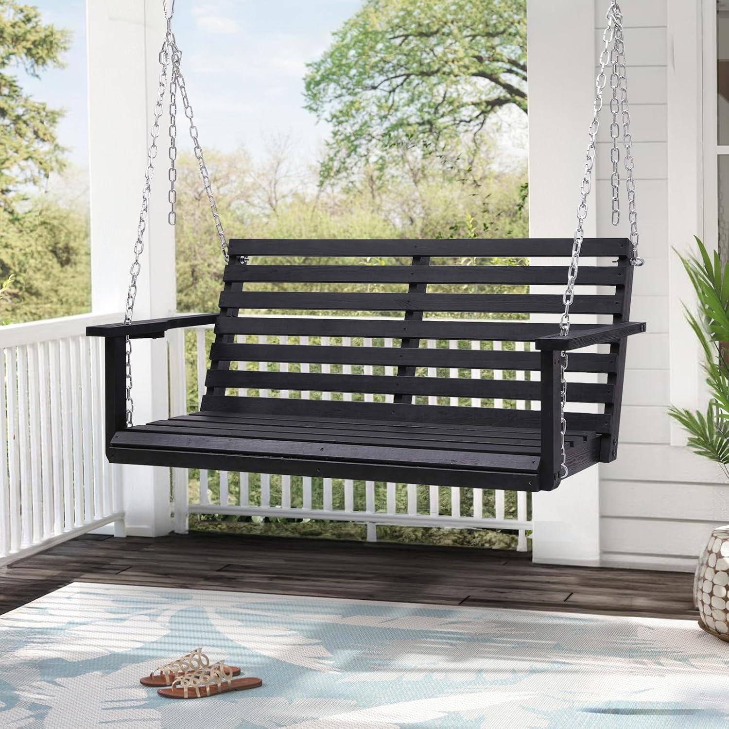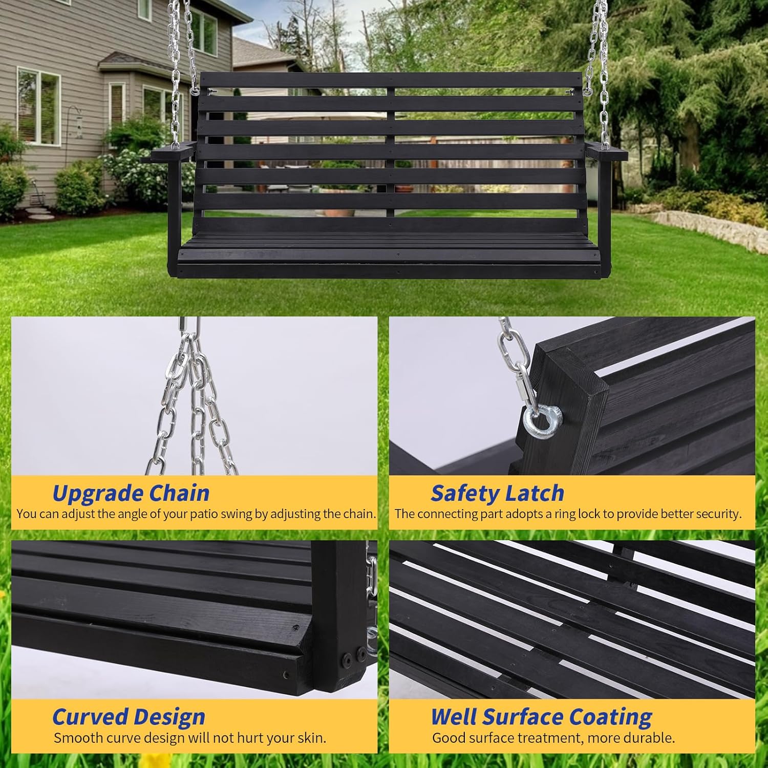 Wooden Porch Swing with Cup Holder, Outdoor Patio Swing Bench for Courtyard & Garden, Upgraded 4 FT Heavy Duty 880 LBS Porch Swing, Outdoor Swing with Hanging Chains, Black