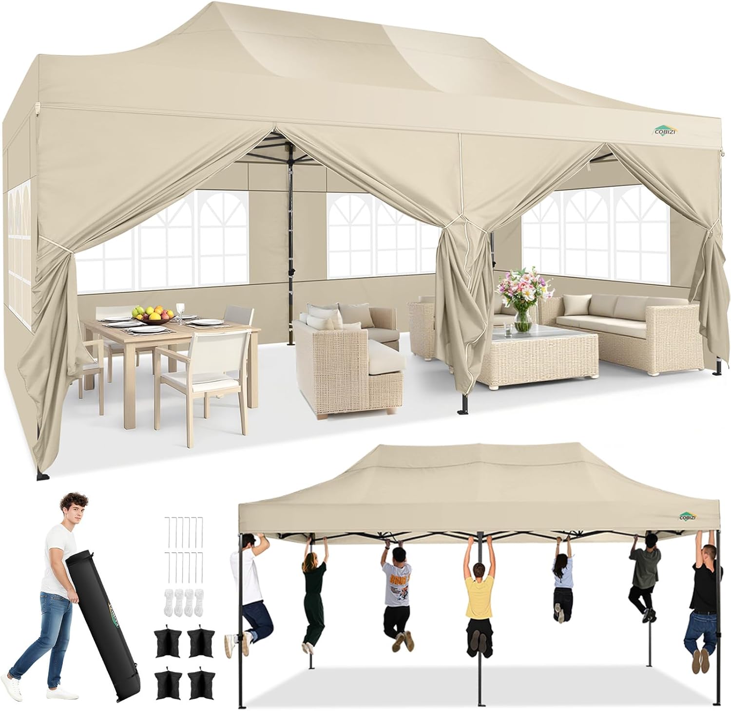 COBIZI 10x20 Pop up Canopy Tent Heavy Duty with 6 Sidewalls, Easy Set-up Commercial Outdoor Party Tent, 100% Waterproof Wedding Canopy Gazebo, 3 Height Adjustable with Wheeled Bag,Khaki
