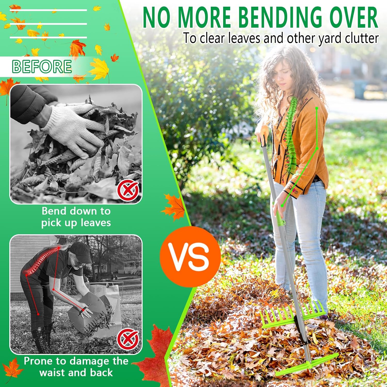- Multi-Tines Strong Grip: Our garden rake is made of lightweight and high-hardness aluminum alloy long handle, withstands pressure and resists rust. Two leaf claws made of premium plastic, 16 inches wide, with 12 hard curved long tines, offer excellent grasping power and can sweep up and grab fallen leaves and debris with ease