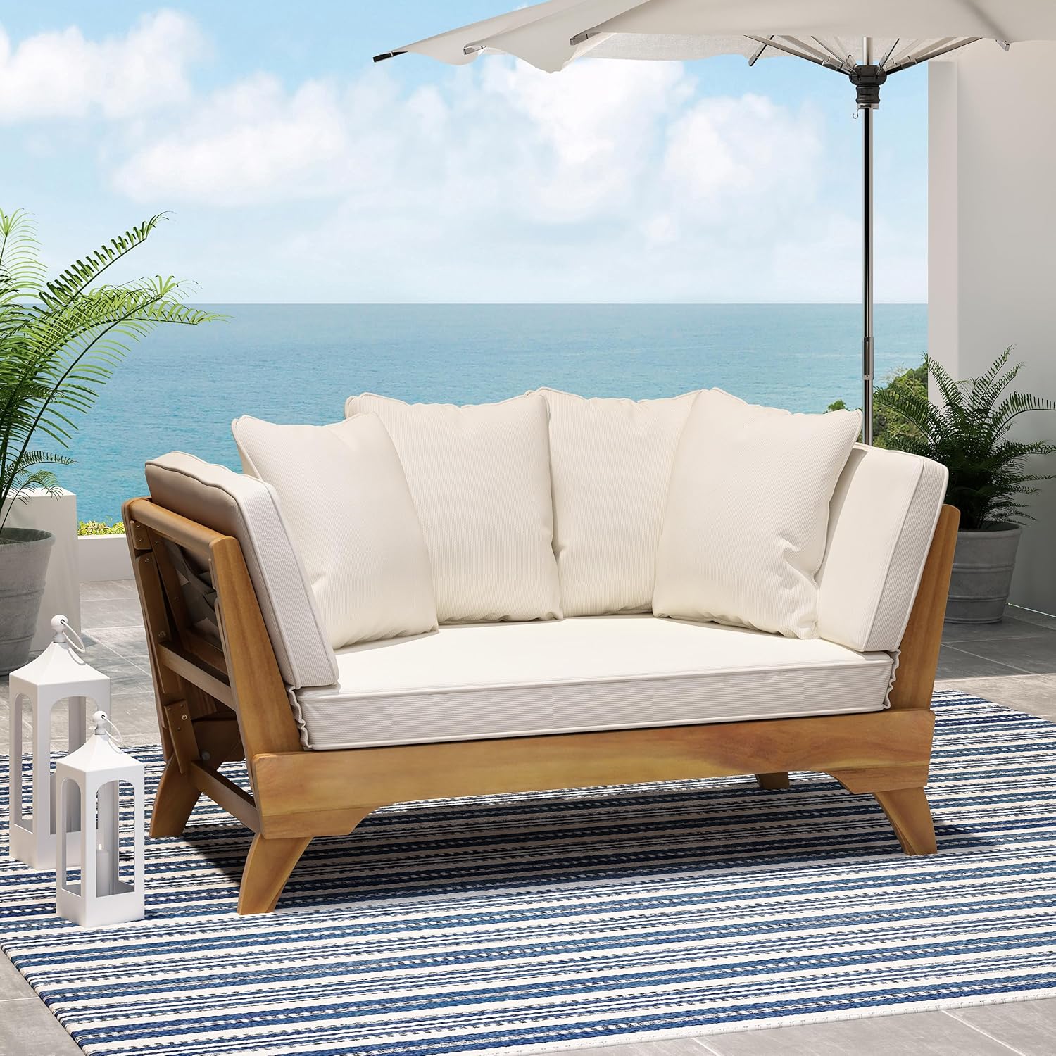 Outdoor Adjustable Patio Wooden Serene Daybed Sofa Chaise Lounge with Cushions for Small Places, Sleeper Chair with Armrest for Backyard, Poolside (Beige)
