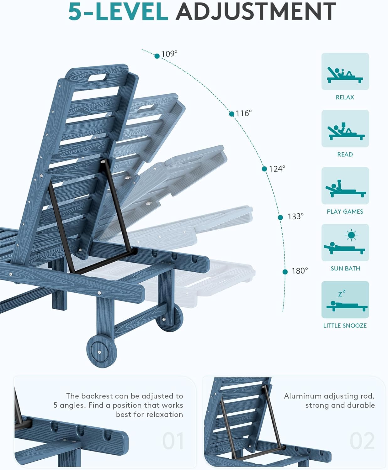 - All Weather Use: Built for all seasons with premium, fade-resistant HDPE lumber. Designed to withstand rain, sun, and wind, this outdoor chaise lounge chair feature 304 stainless steel screws, enjoy years of beauty, season after season