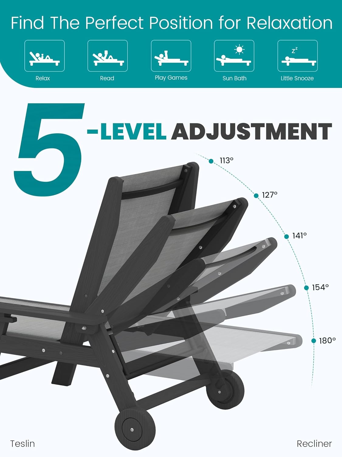 SERWALL Textilene Patio Chaise Lounge Chair Set of 2, 5 Positions Outdoor Lounge Chair with Rolling Wheels for Pool, Deck, Black