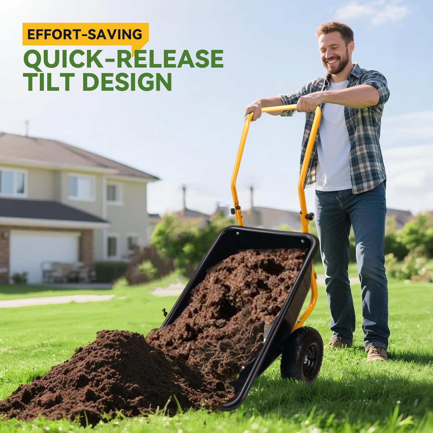 - High-Capacity 330 LBS Load Support:Built for heavy-duty tasks,this garden cart can handle up to 330 lbs (150 kg) of weight,making it suitable for construction debris,rocks,soil,or bulk gardening materials.The rustproof powder-coated steel frame and reinforced PP plastic bin resist cracking,bending,and corrosion,ensuring long-term durability in demanding conditions.