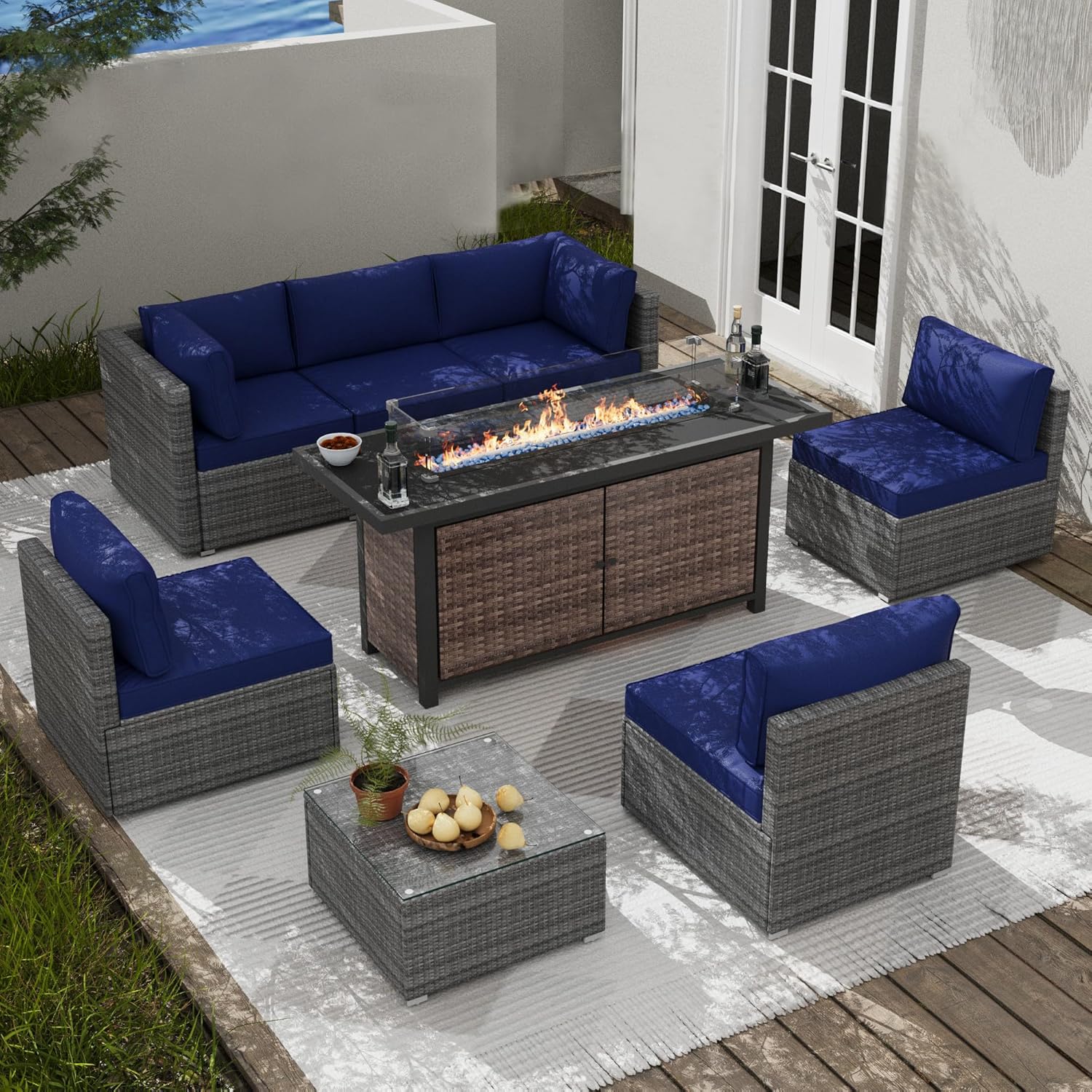25-Pc Patio Furniture Set - 7 Piece Outdoor Rattan Sofa Set with 57" Fire Table and 17 Accessories, Modular Sofa Set for Garden/Poolside, Navy Blue/Grey
