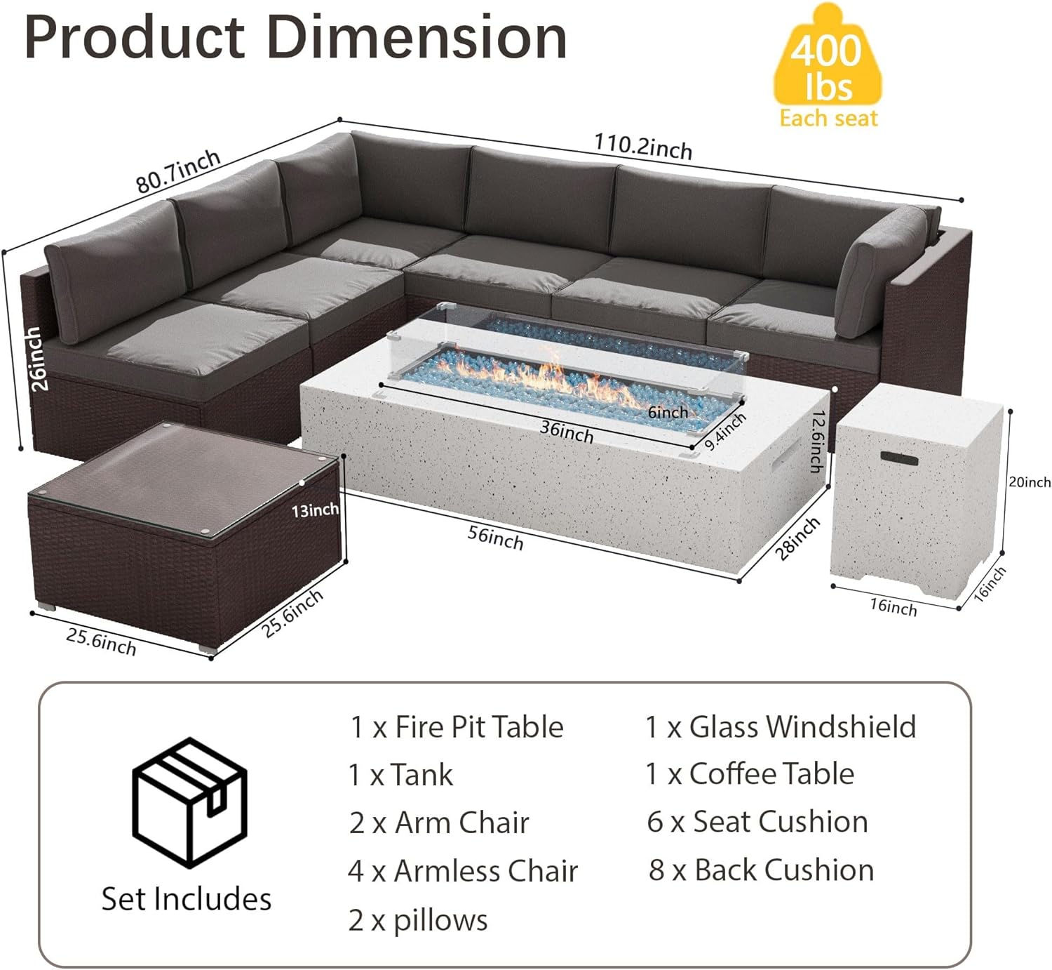 8 Piece Patio Furniture Set - Outdoor Conversation Sets with 56" Fire Table and Coffee Table, Rattan Modular Sofa Set for Garden/Poolside, Grey/Brown