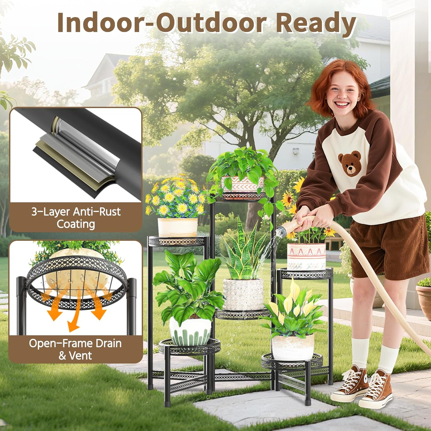• 【Built to Last】Our plant holder indoor stand is designed with longevity in mind. It features a rust-proof coating that withstands sun, rain, and daily watering—no rust, no worries. The smooth surface is easy to clean—just wipe up spills with a damp cloth and it looks brand new.