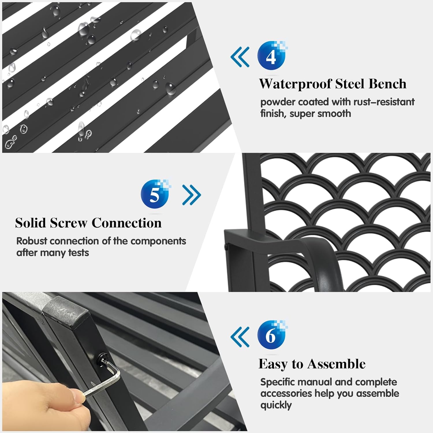 - Durable Steel Construction: Unlike easily deformed wood, this outdoor garden bench made of premium steel can still support well after years of sun exposure. It is also with powder coating that enables the bench to be rustproof and weather resistant. Besides, steel slatted seat can prevent water accumulation in rainy days, which is perfect for outdoor use.