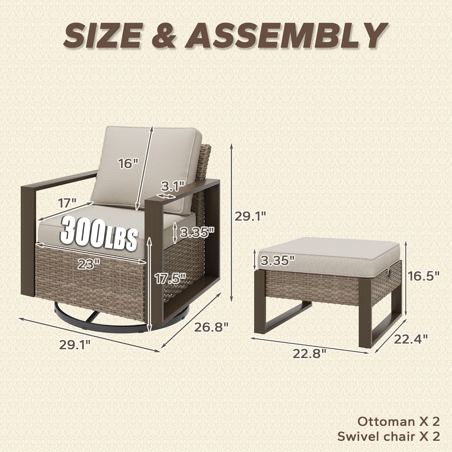 - Size : 4 PCS Swivel Chairs & Ottomans Set